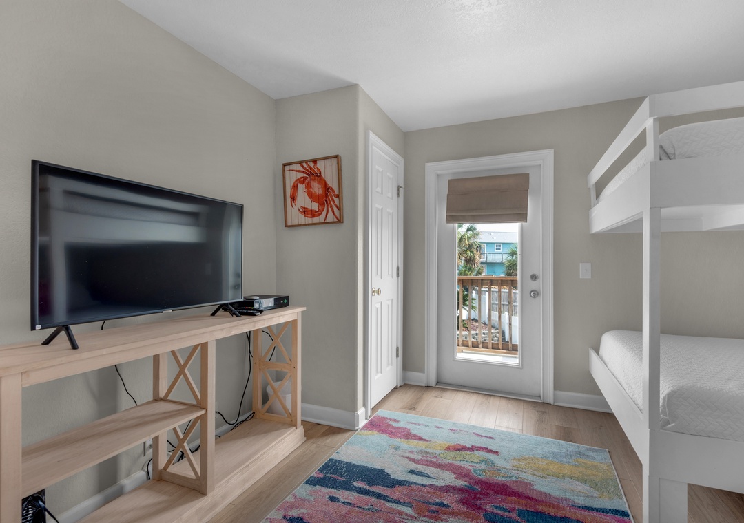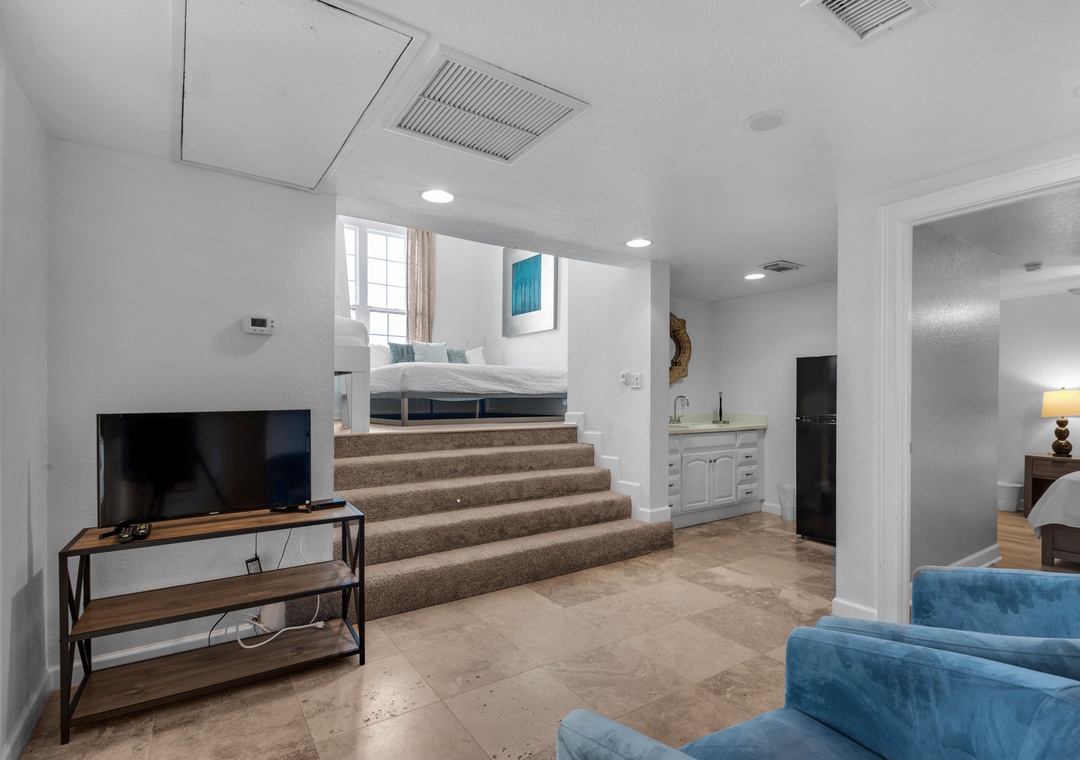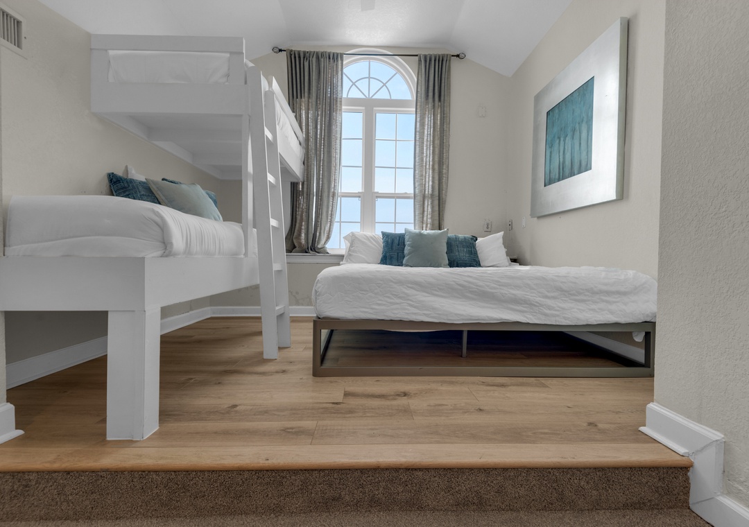 Loft Area: King Platform Bed + Two Twin Bunk Beds