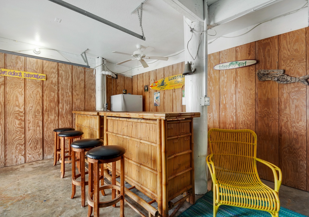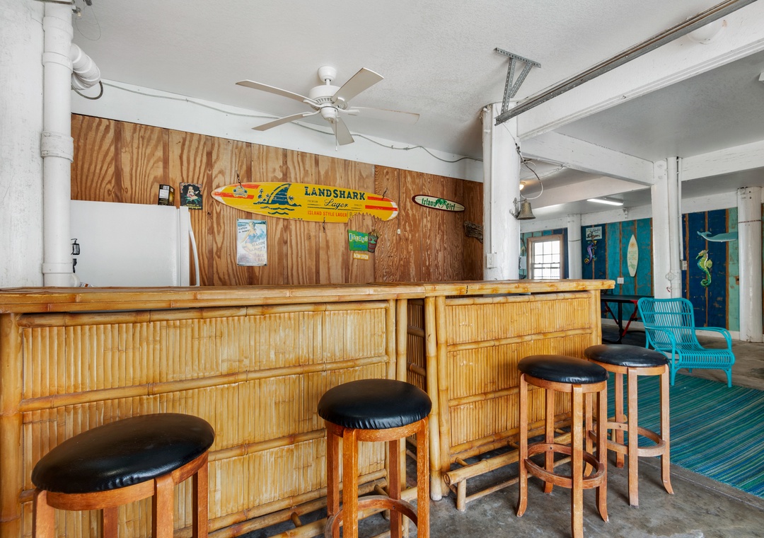 Downstairs, the fun continues in the game room, which opens out to a private lagoon-shaped pool and tiki bar. You'll also find a second fridge, pool and ping pong tables, foosball, and outdoor seating – plus beach wagons, toys, and more to make your stay seamless and fun-filled.