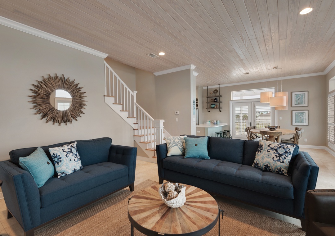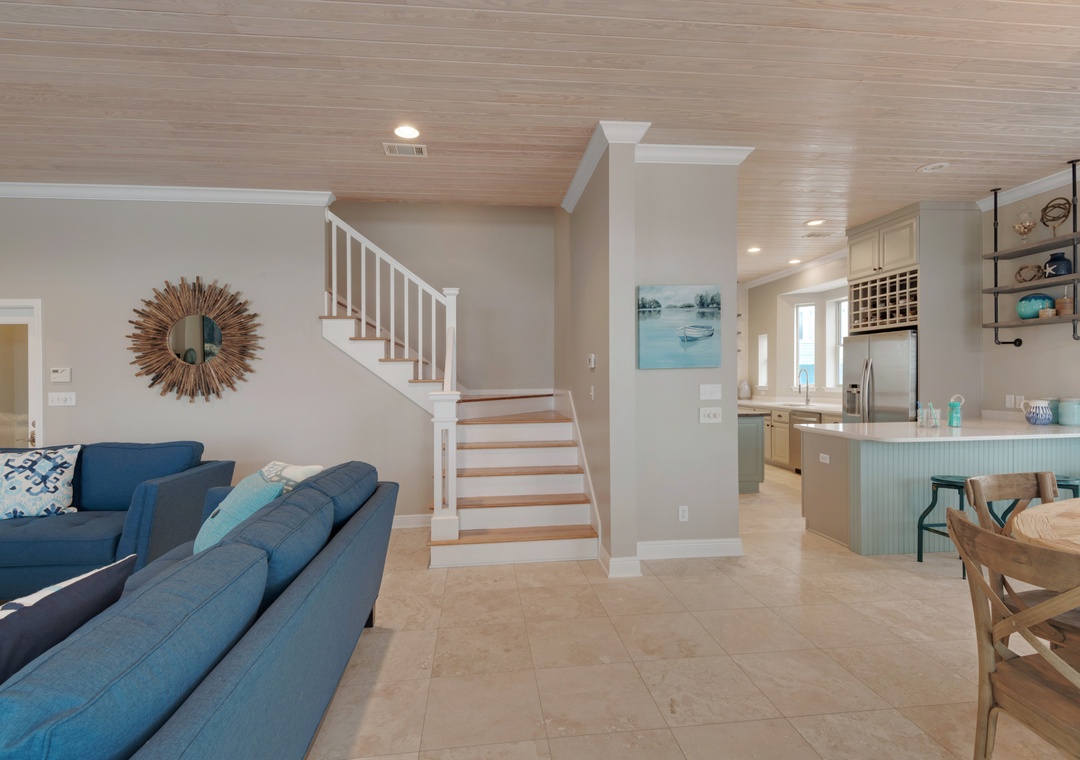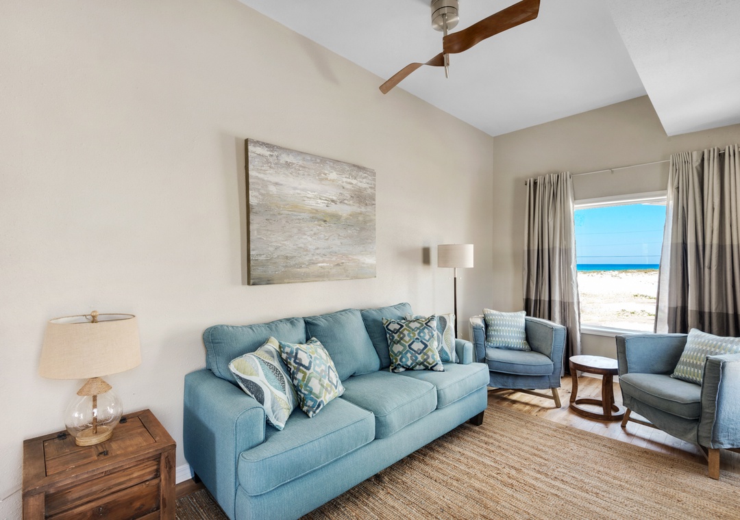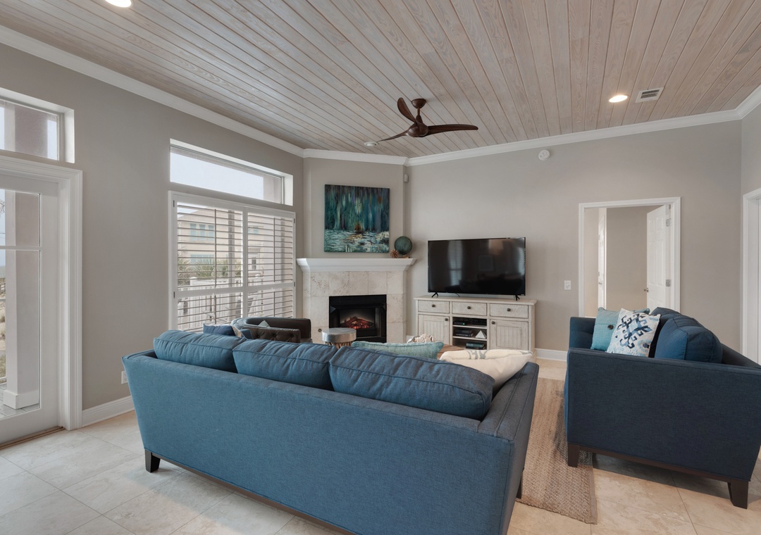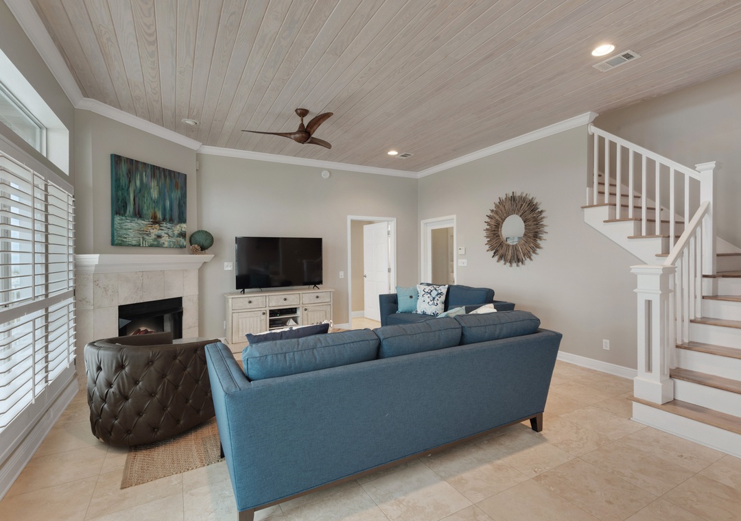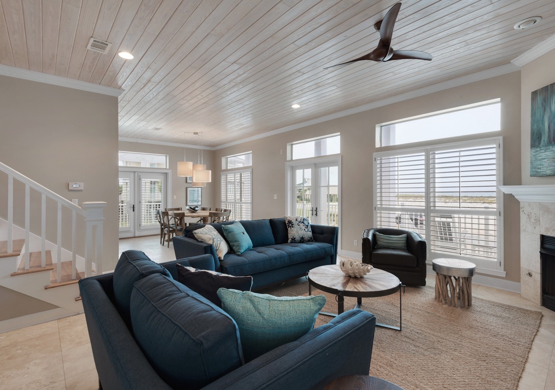 The main floor showcases a designer kitchen with upgraded appliances, bar seating, and adjacent indoor and outdoor dining areas. Two living rooms—one with a cozy fireplace and one with a sleeper sofa and TV—make it easy for guests to spread out. The master suite is located on the main floor and features a king bed, private en-suite bath, and direct deck access with Gulf views.