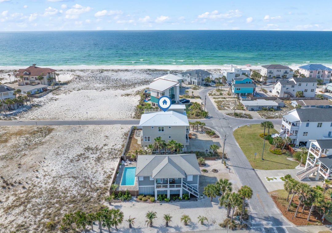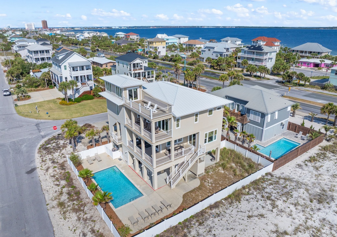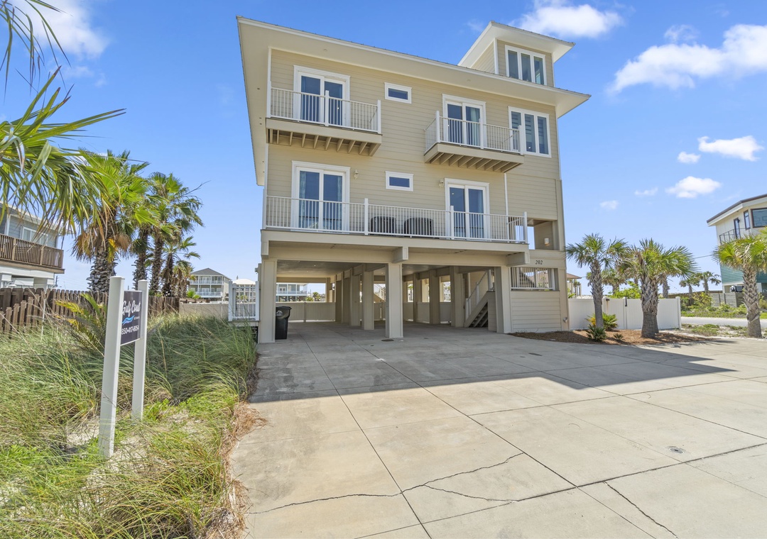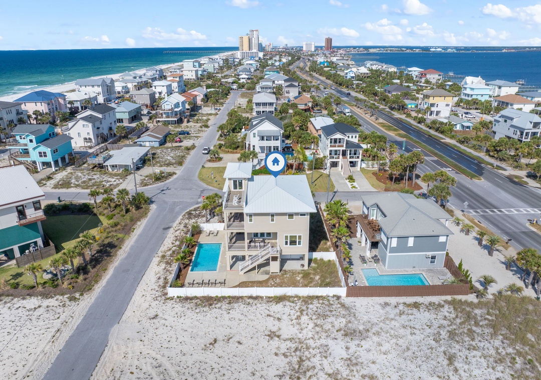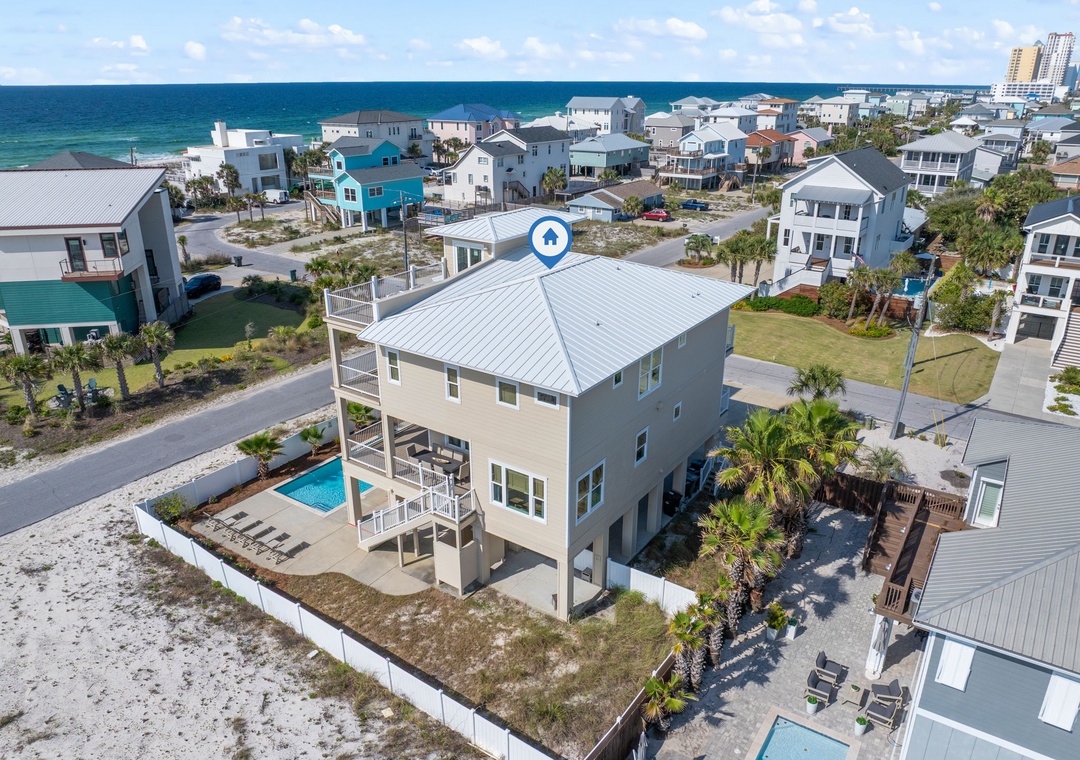 Welcome to Castle de Playa, a one-of-a-kind luxury retreat on Pensacola Beach, located just one mile from the main boardwalk area yet tucked into a peaceful residential stretch. This stunning 6-bedroom, 6-bathroom home comfortably sleeps 25 and is ideal for weddings, reunions, or unforgettable family vacations. The property is adjacent to protected county-owned land, granting direct, unobstructed Gulf views and easy beach access.