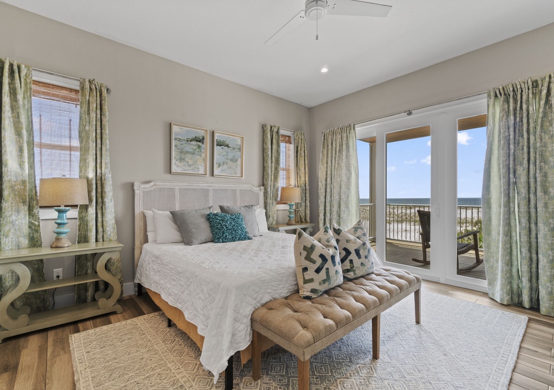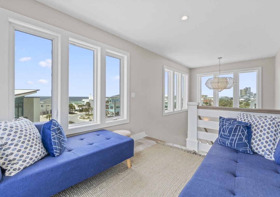 Inside, guests are welcomed by a grand open-concept main level with a fully stocked chef’s kitchen, stylish living space, and expansive indoor/outdoor dining options. The second floor features a cozy lounge with a wet bar and built-in bunks, perfect for teens or additional guests. The top-level rooftop deck and enclosed sunroom offer panoramic views of the Gulf—ideal for coffee at sunrise or cocktails at sunset. Every detail has been thoughtfully curated, including designer décor, custom bunk rooms, spa-inspired bathrooms, and an elevator for effortless access.