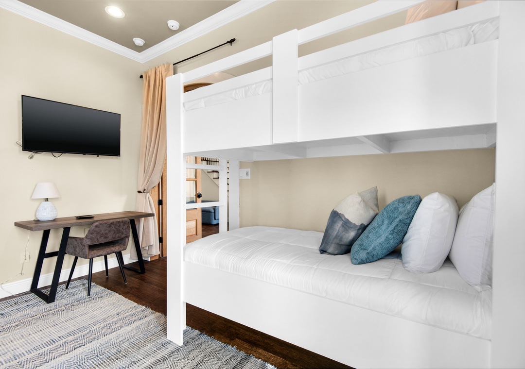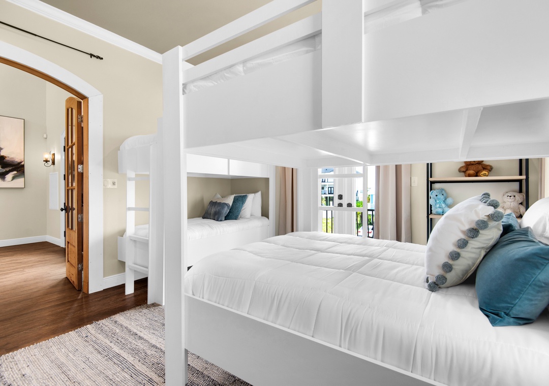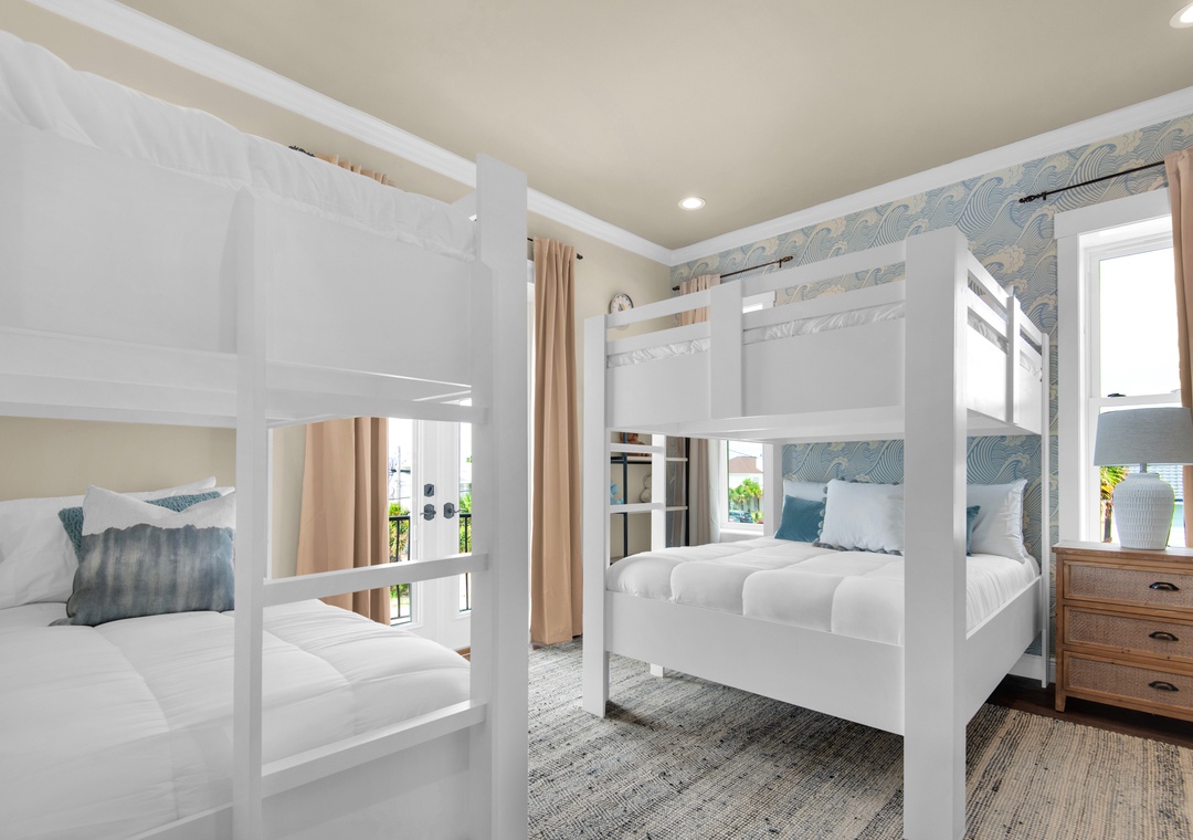 Bedroom #1: Custom Bunk Room with 2 Queen + 2 Twin Bunks (Sleeps 6)