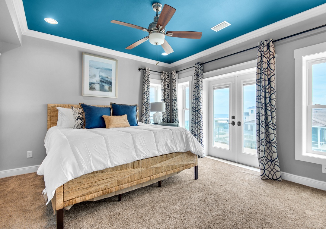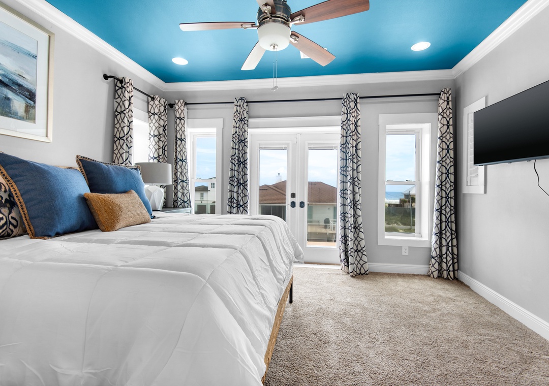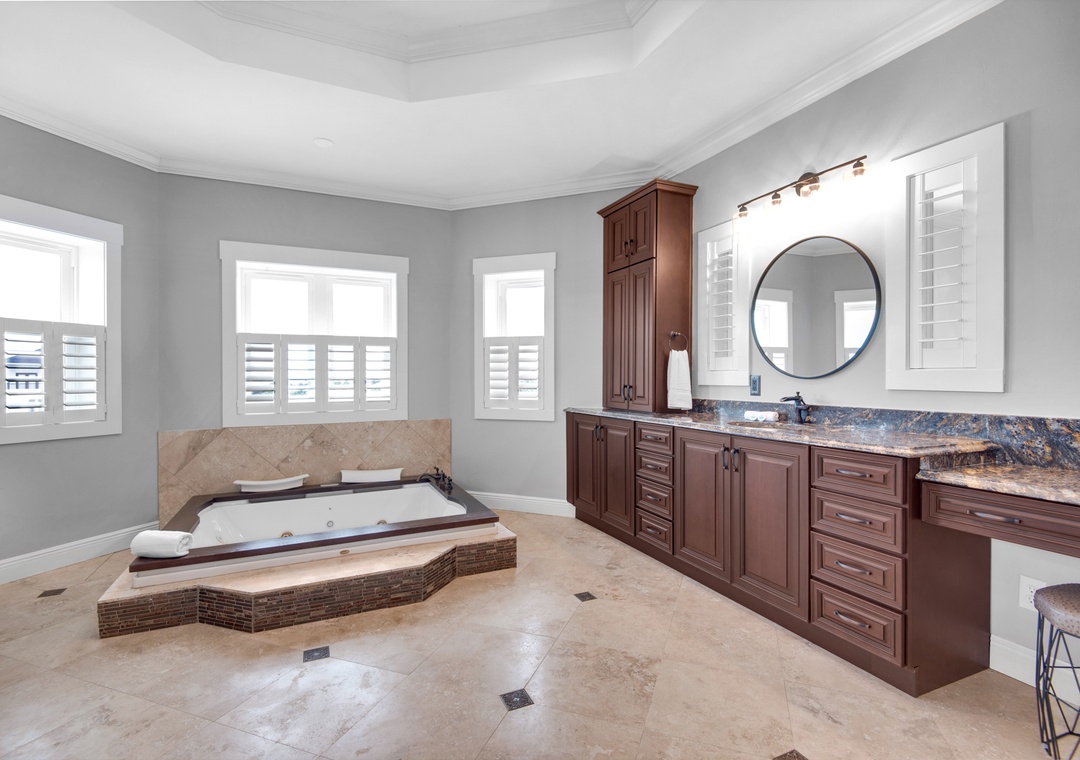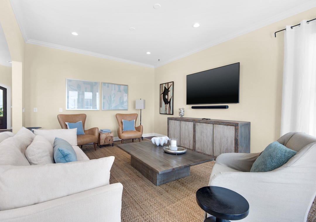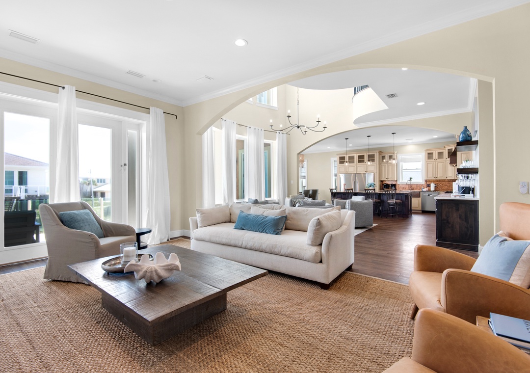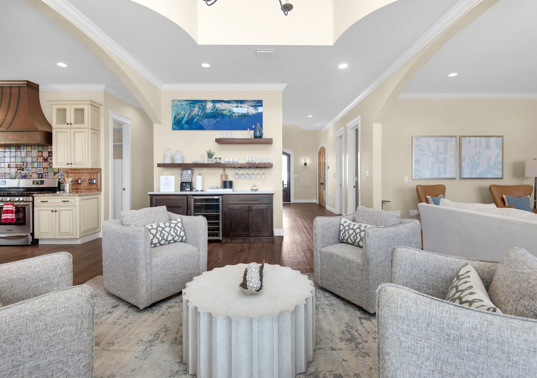 Gather in the open-concept great room, where the chef’s kitchen is outfitted with double refrigerators and ovens, a massive island, wine fridge, and wet bar. The space flows seamlessly into the dining and living areas, perfect for shared meals and sunset chats. Head outside to the private saltwater pool or climb up to the rooftop deck for a soak in the hot tub with 360-degree island views.