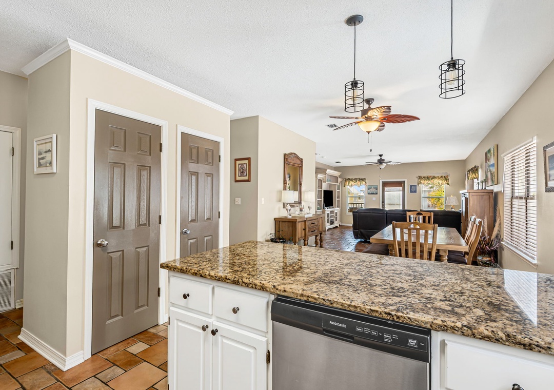 Inside, you’ll find a bright, open-concept layout designed for comfort and gathering, featuring 9-foot ceilings, tile flooring throughout, and a stylish island kitchen with granite countertops. Whether you're preparing meals or entertaining, the space is both functional and inviting.