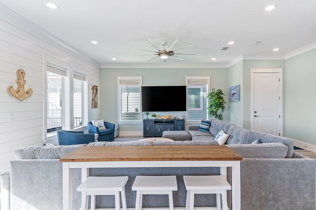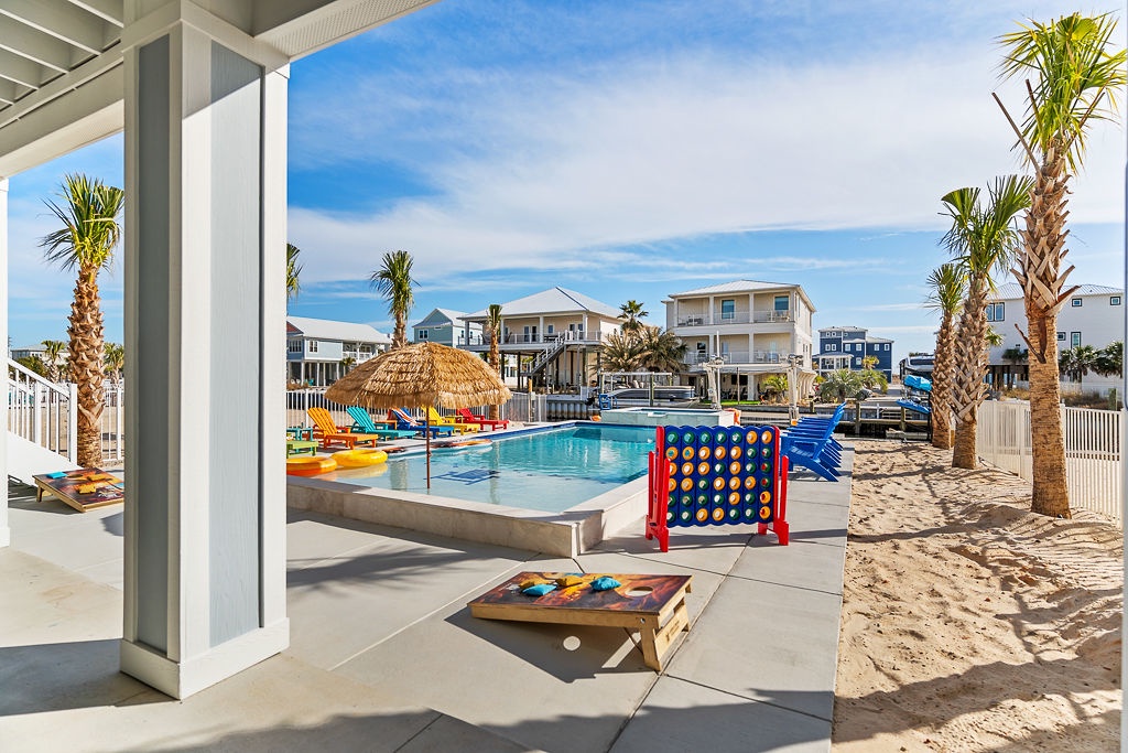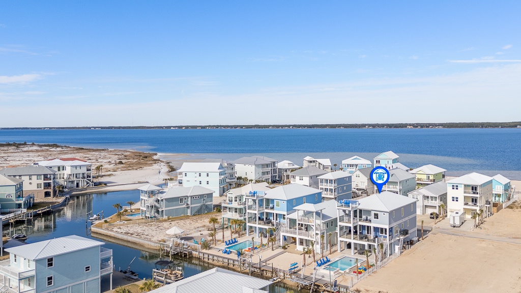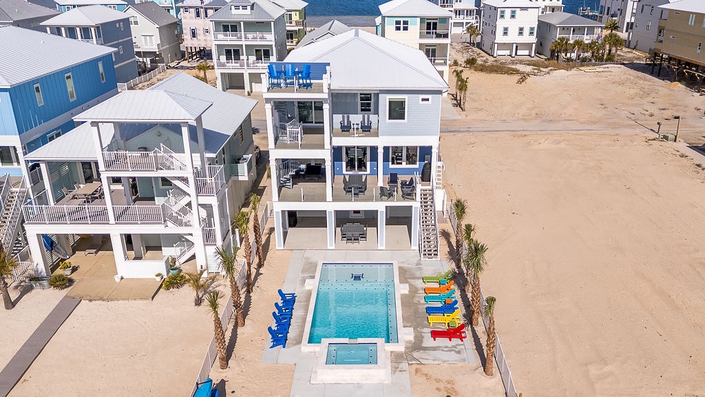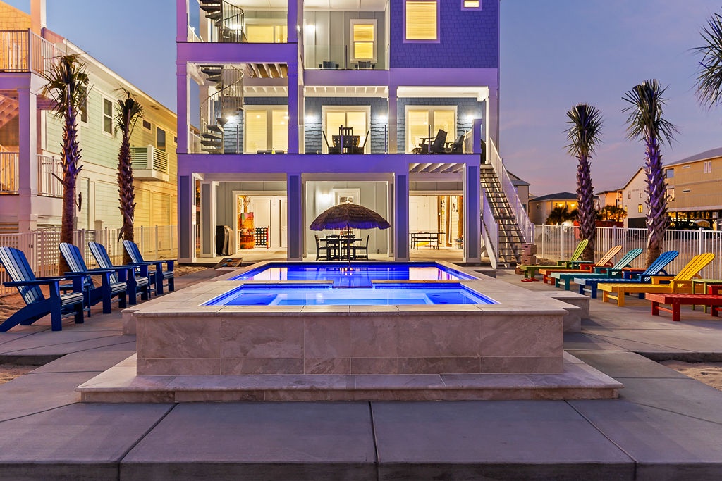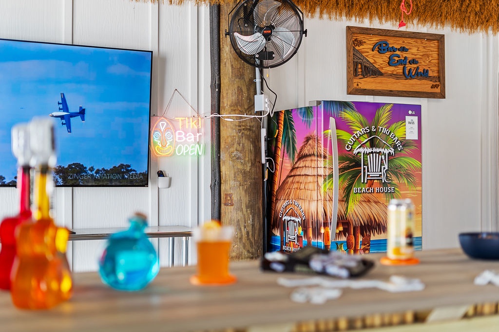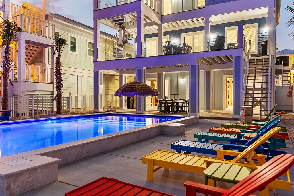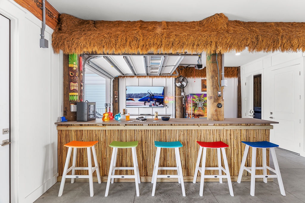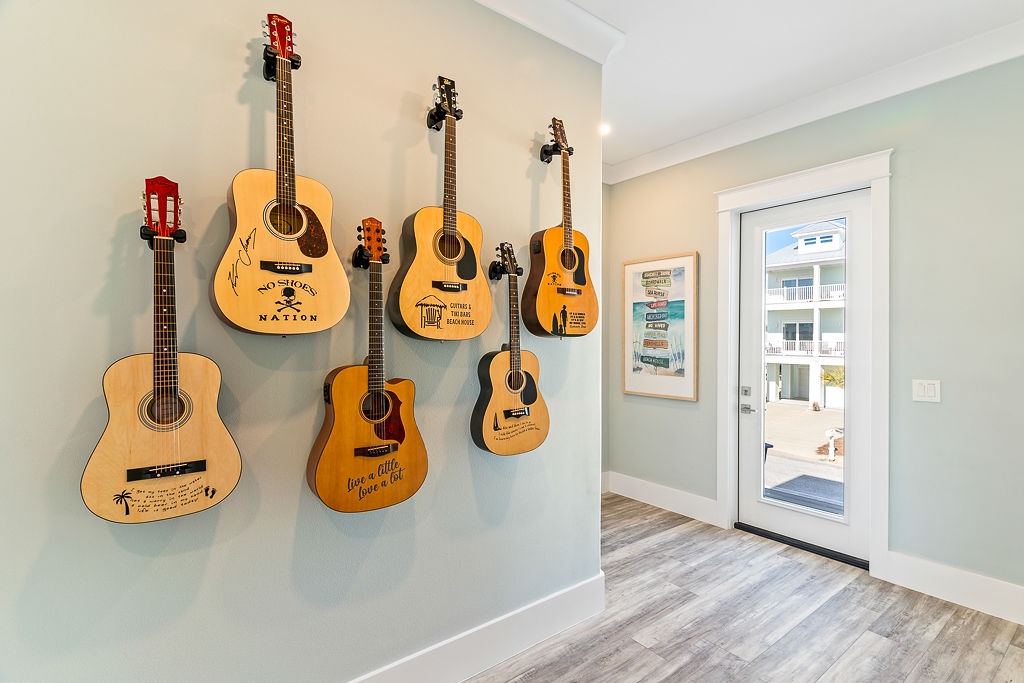 Welcome to Guitars and Tiki Bars, where barefoot luxury meets laid-back island style. Set in Grand Navarre with panoramic Gulf and Sound views, this three-level, 5-bedroom, 7-bathroom beach house is a dream getaway for up to 20 guests. Enjoy sunset cocktails at the garage-level Tiki bar, splash into the private pool and hot tub, or lounge on the expansive rear deck while enjoying canal breezes. Inside, custom furnishings, an open concept living space, and designer coastal finishes create the perfect setting for group connection and relaxation.