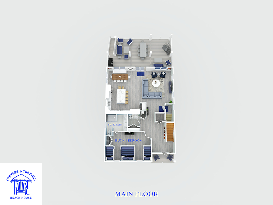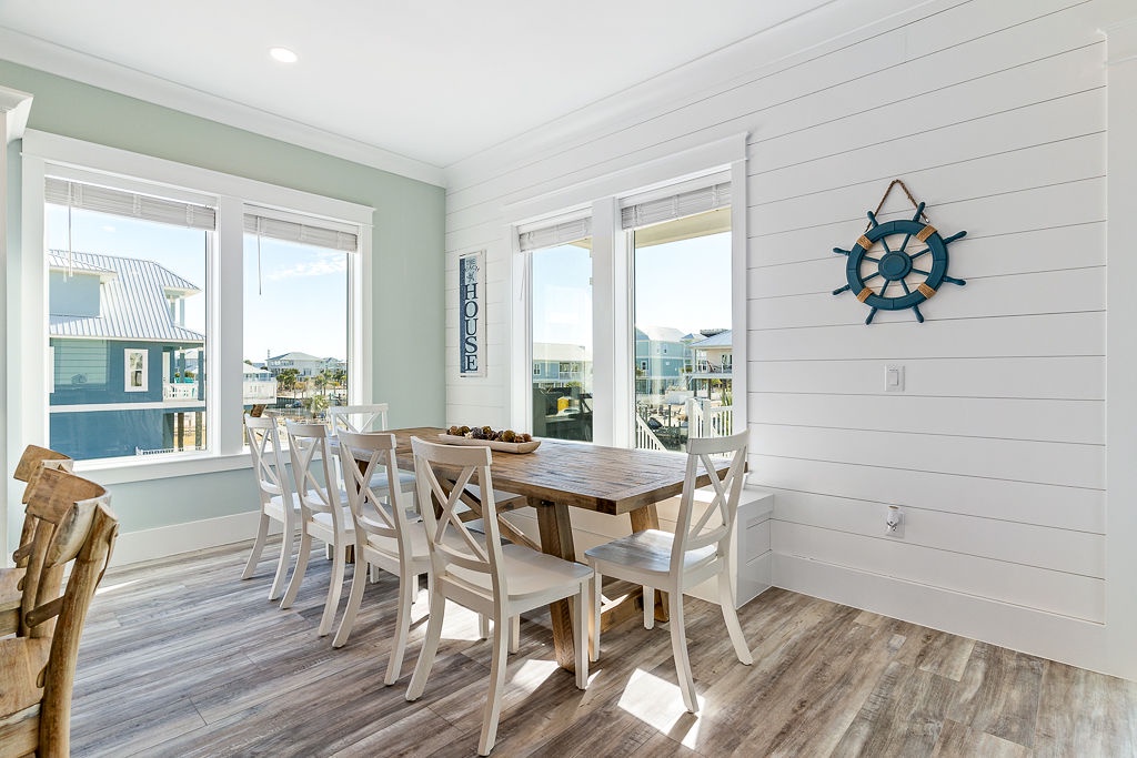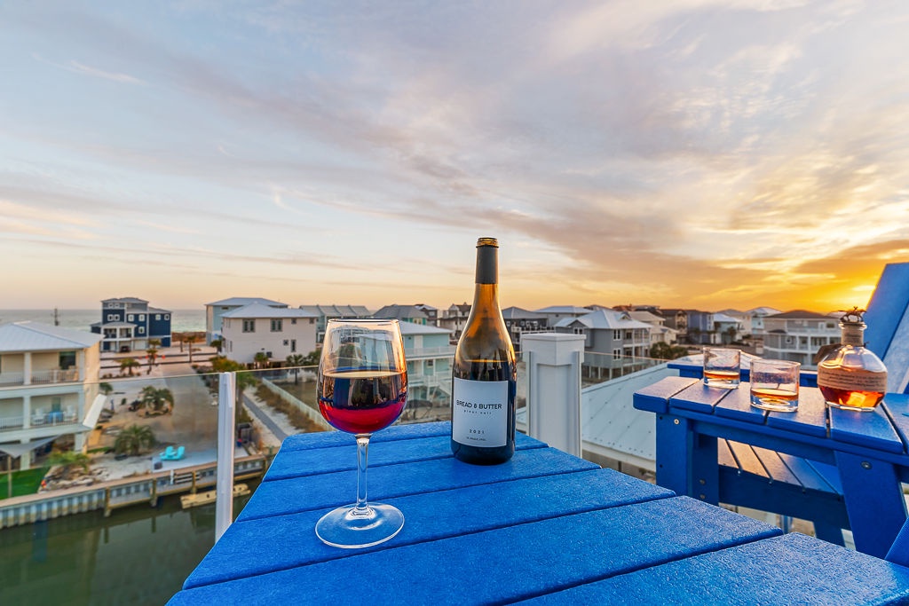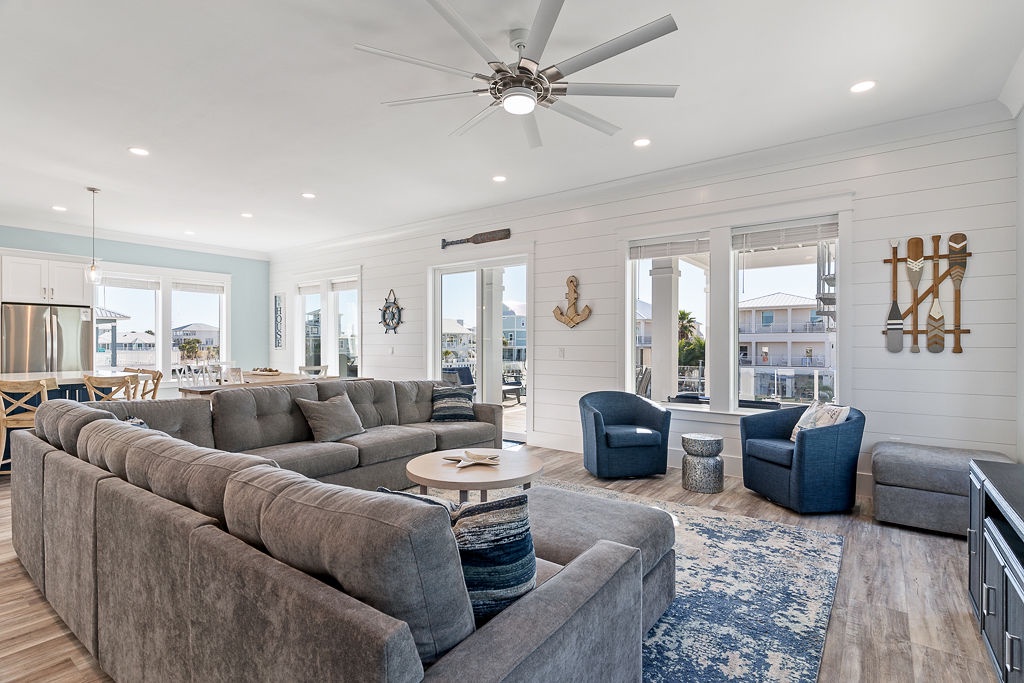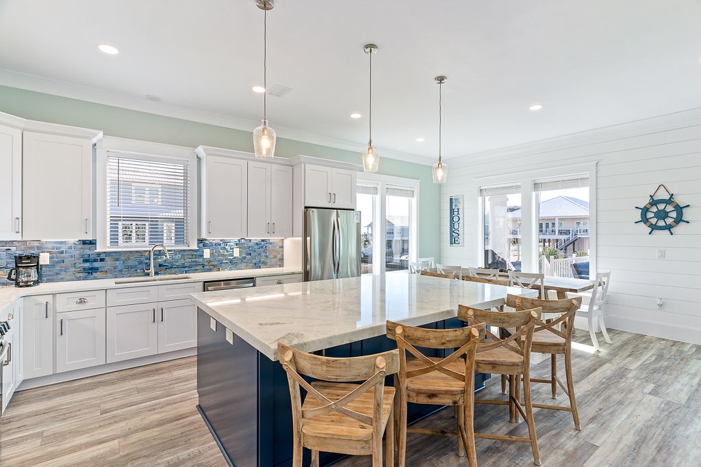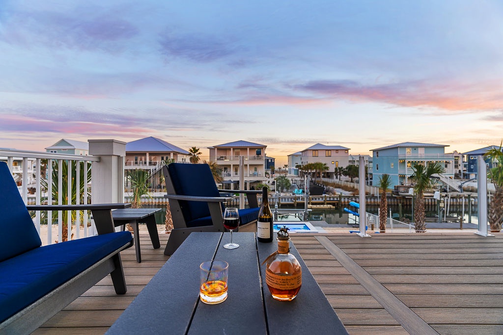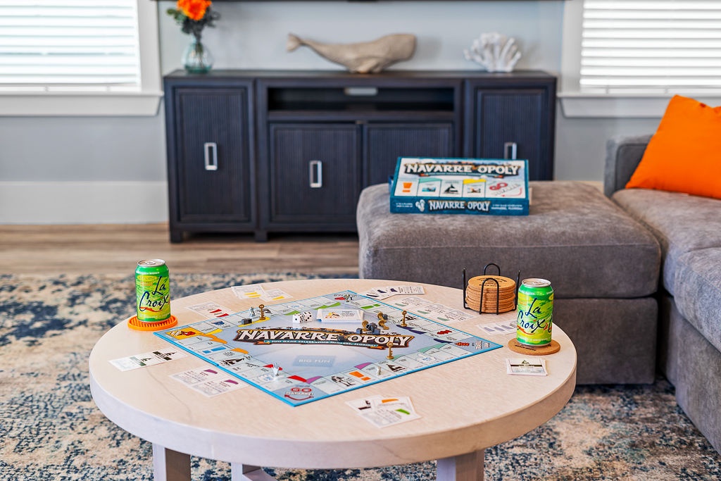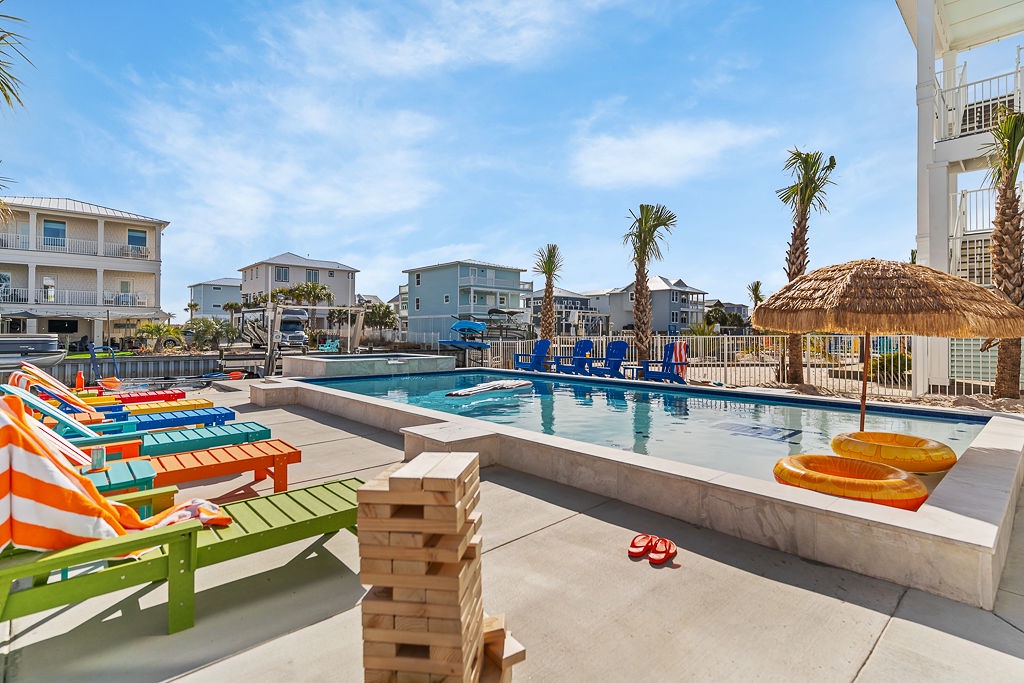 Welcome to Guitars and Tiki Bars, where barefoot luxury meets laid-back island style. Set in Grand Navarre with panoramic Gulf and Sound views, this three-level, 5-bedroom, 7-bathroom beach house is a dream getaway for up to 20 guests. Enjoy sunset cocktails at the garage-level Tiki bar, splash into the private pool and hot tub, or lounge on the expansive rear deck while enjoying canal breezes. Inside, custom furnishings, an open concept living space, and designer coastal finishes create the perfect setting for group connection and relaxation.