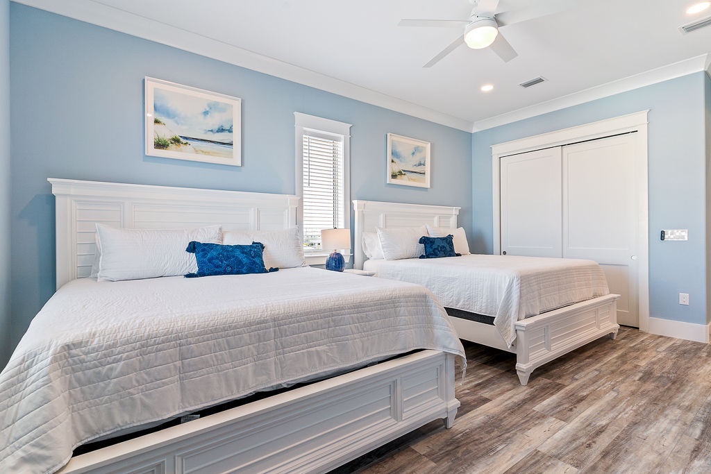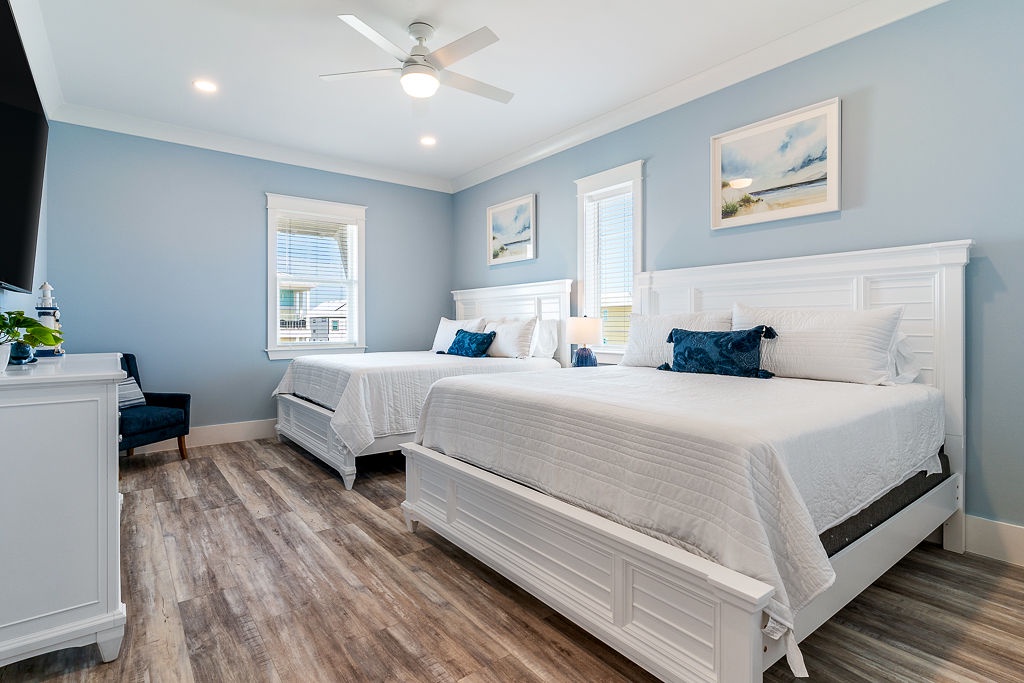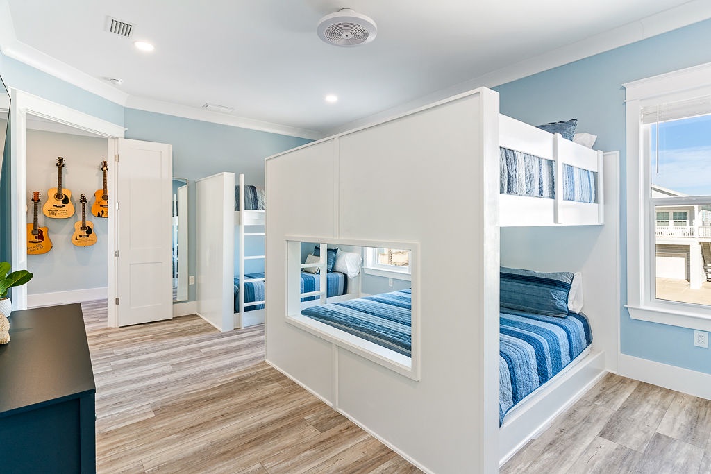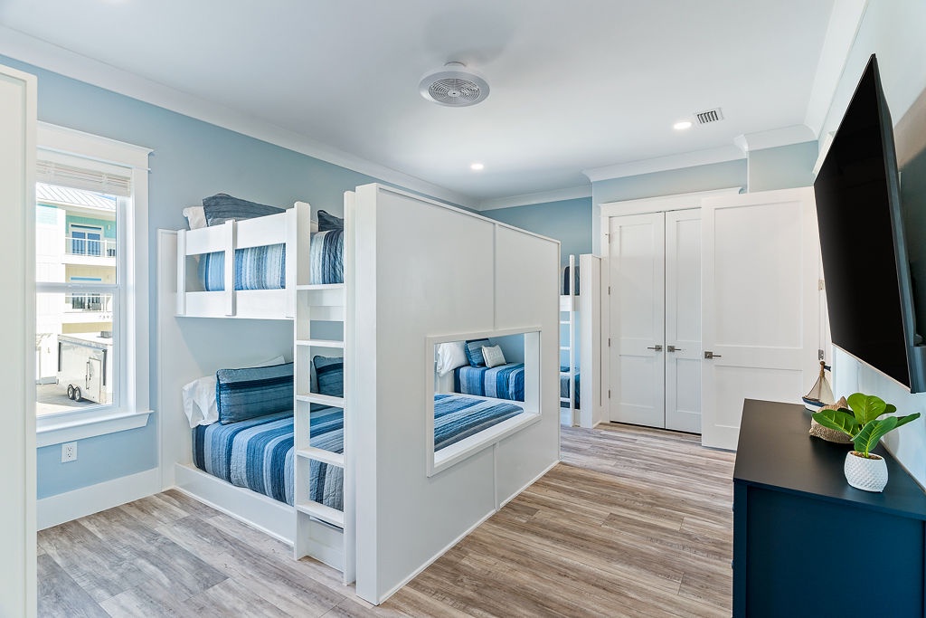 Every bedroom is thoughtfully designed for privacy and comfort. The main level features a built-in bunk room with an en-suite bath, ideal for kids or teens, while the top floor includes four king bedrooms, each with its own private bathroom. The spacious great room, gourmet kitchen with bar seating, and large dining table set the stage for unforgettable vacation moments. The upper-level lunar deck offers unbeatable sunrise-to-sunset views.