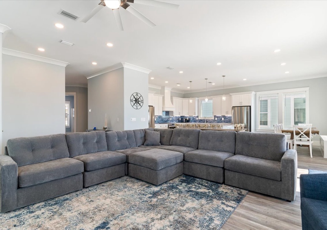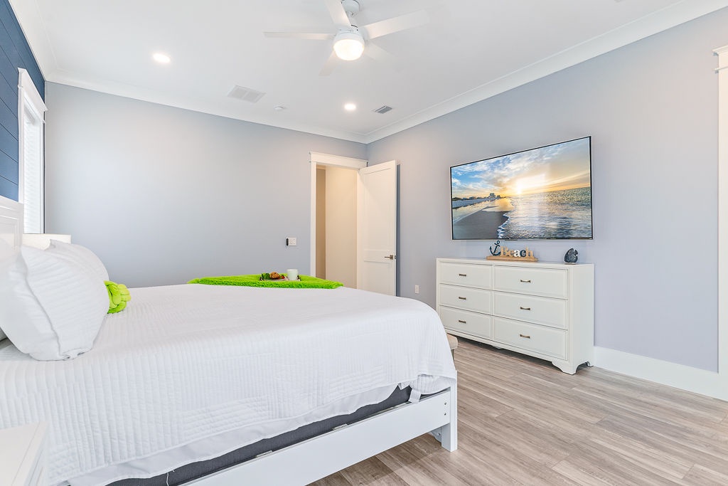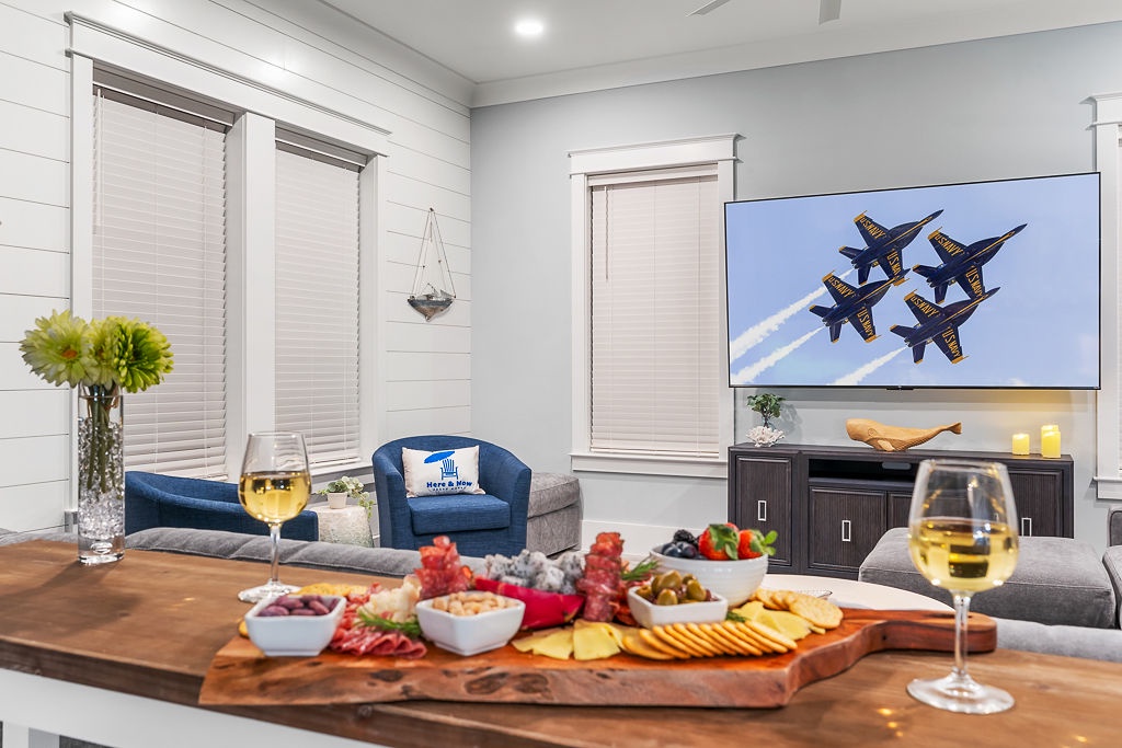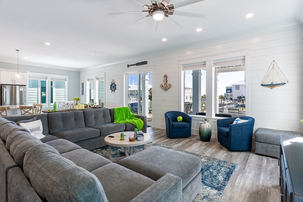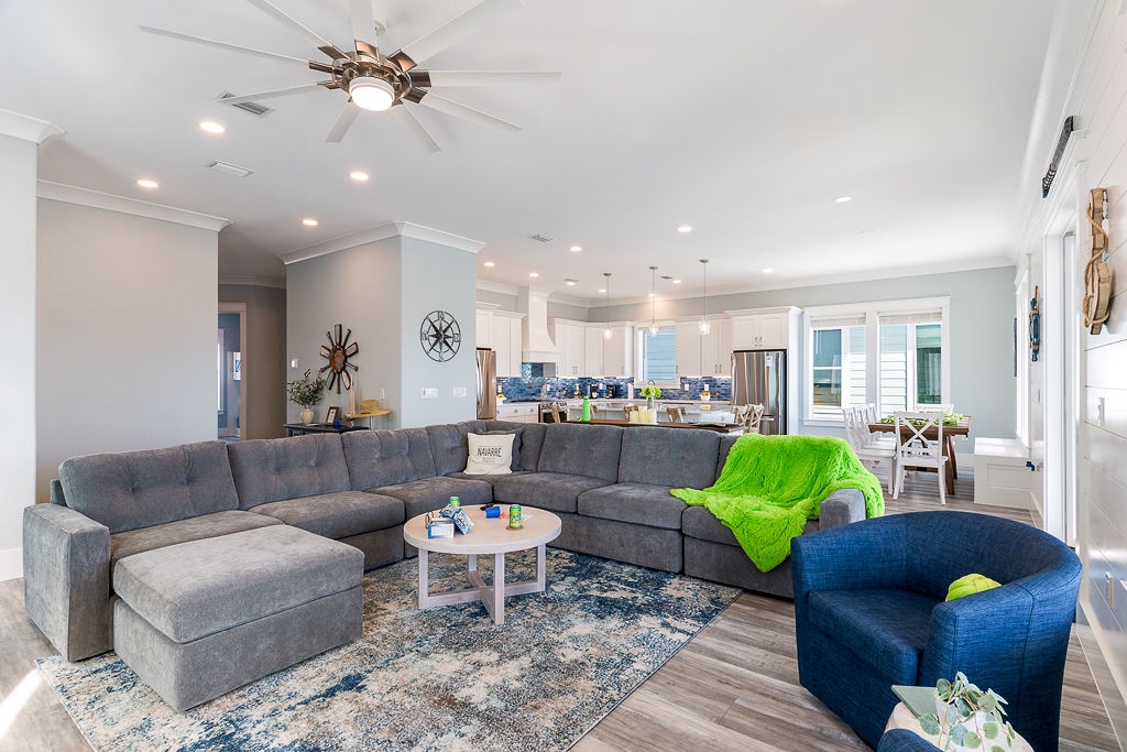 Settle into a luxury coastal escape at The Here and Now Beach House, where every detail is designed for comfort, style, and unforgettable group gatherings. Located on Navarre Beach’s western edge in Grand Navarre, this 3,700-square-foot canalfront retreat features five bedrooms, seven bathrooms, and a floor plan perfectly tailored for large families or multi-group stays.
