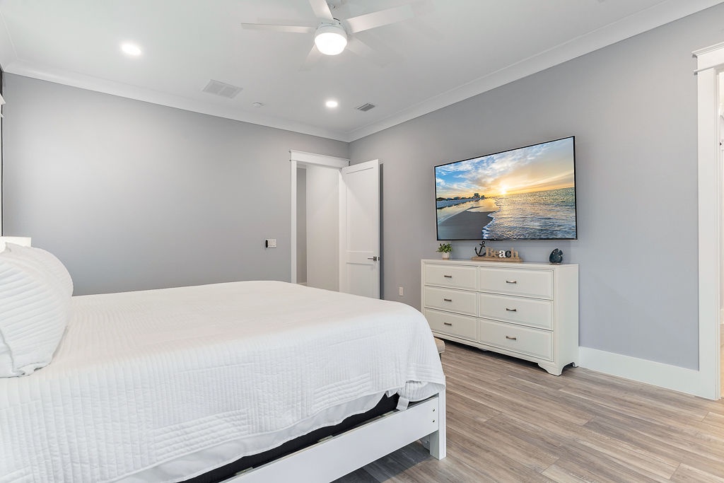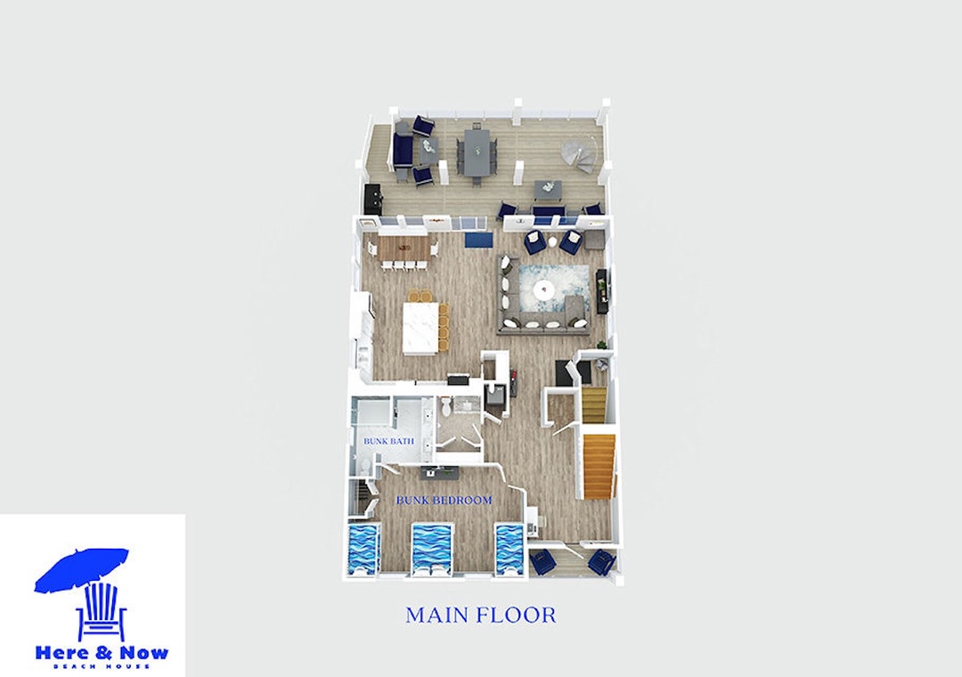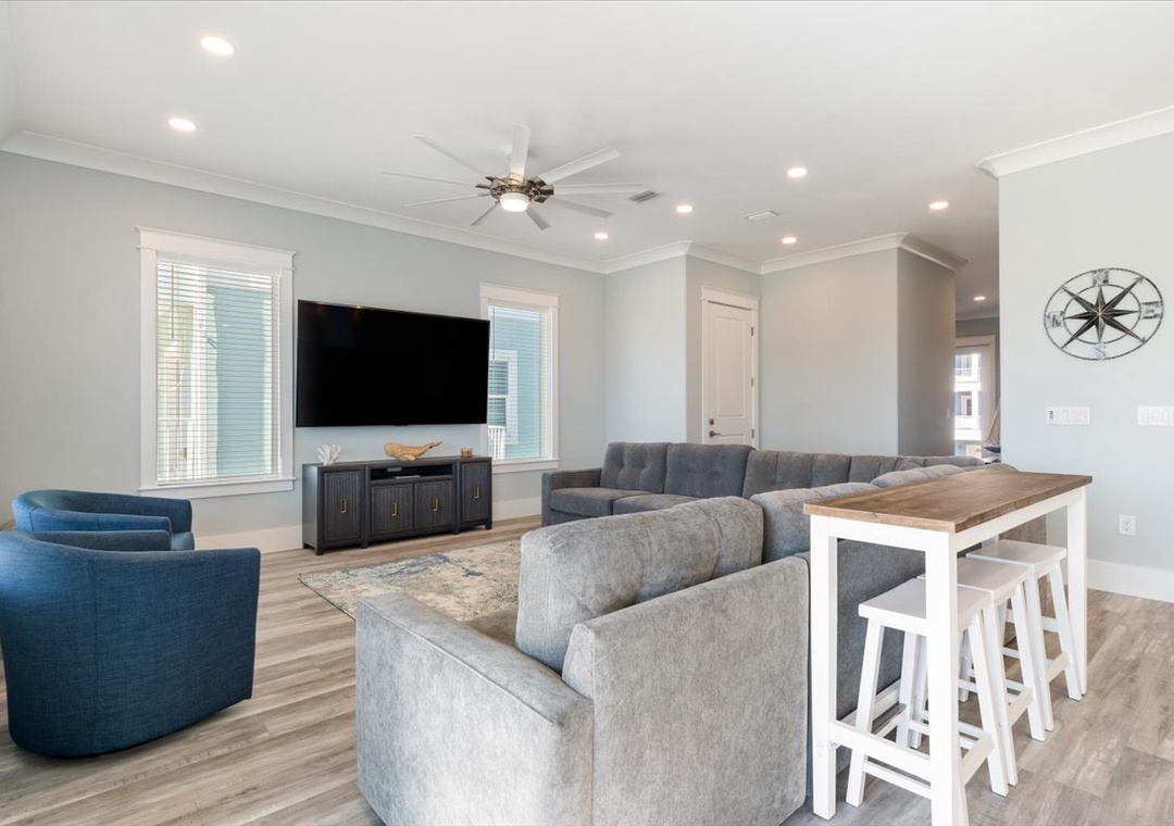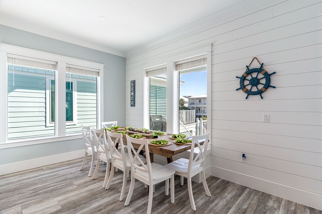 Settle into a luxury coastal escape at The Here and Now Beach House, where every detail is designed for comfort, style, and unforgettable group gatherings. Located on Navarre Beach’s western edge in Grand Navarre, this 3,700-square-foot canalfront retreat features five bedrooms, seven bathrooms, and a floor plan perfectly tailored for large families or multi-group stays.