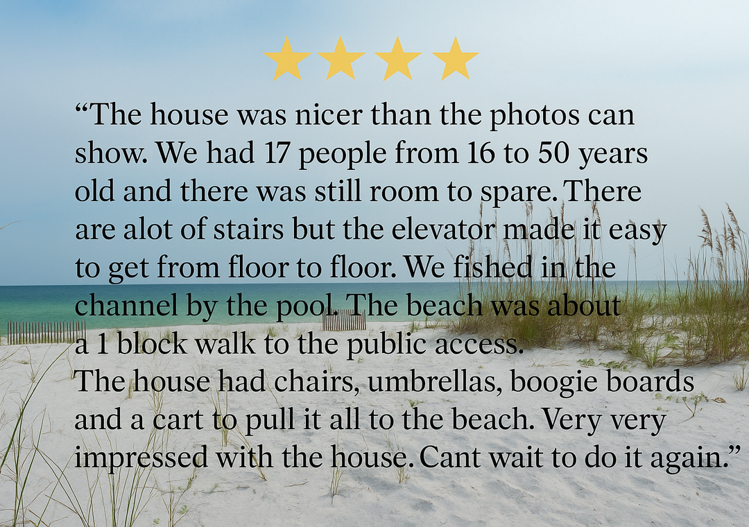 Thank you for the wonderful 5-star review! We're glad the house exceeded your expectations and that the elevator made getting around easier for your group. It's great to hear you enjoyed the fishing and the convenience of the beach gear. We look forward to welcoming you back for another stay soon! Gulf Coast GetawaysFlorida Gulf Coast Getaways staff