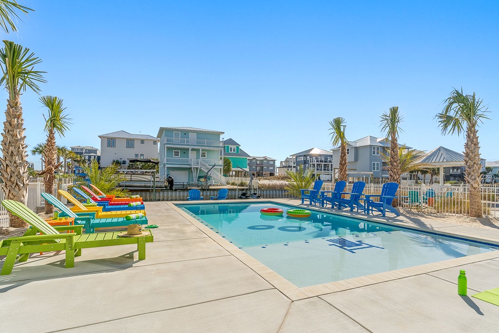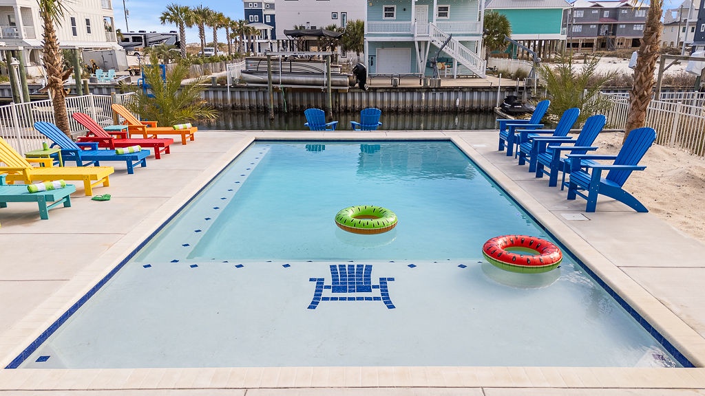 The open-concept main level features a spacious kitchen with a large island, modern appliances, and ample dining space. A built-in bunk bedroom with ensuite bath adds flexible sleeping arrangements. Upstairs, four king suites each include private bathrooms, allowing every guest to unwind in peace. The expansive rear deck, private pool area, and upper-level lunar deck showcase the best of Gulf and canal views—ideal for sunbathing, stargazing, or simply relaxing with your favorite drink.