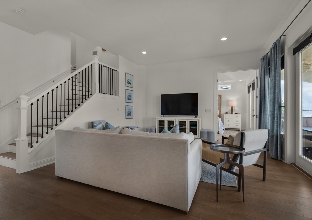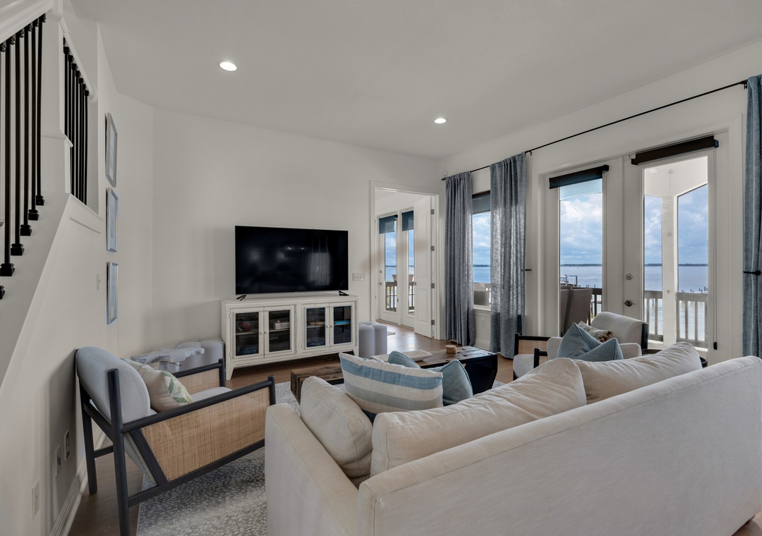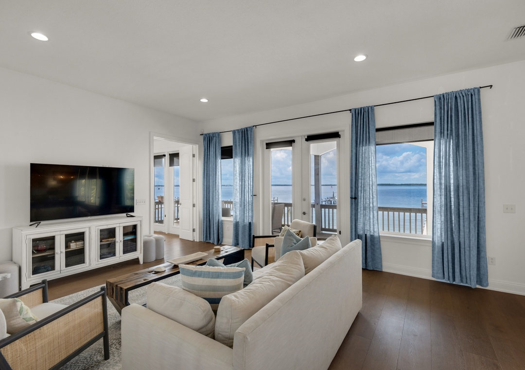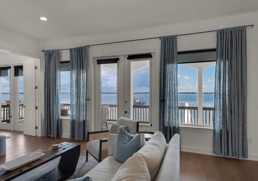 Open Living Room with Sound Views + Deck Access