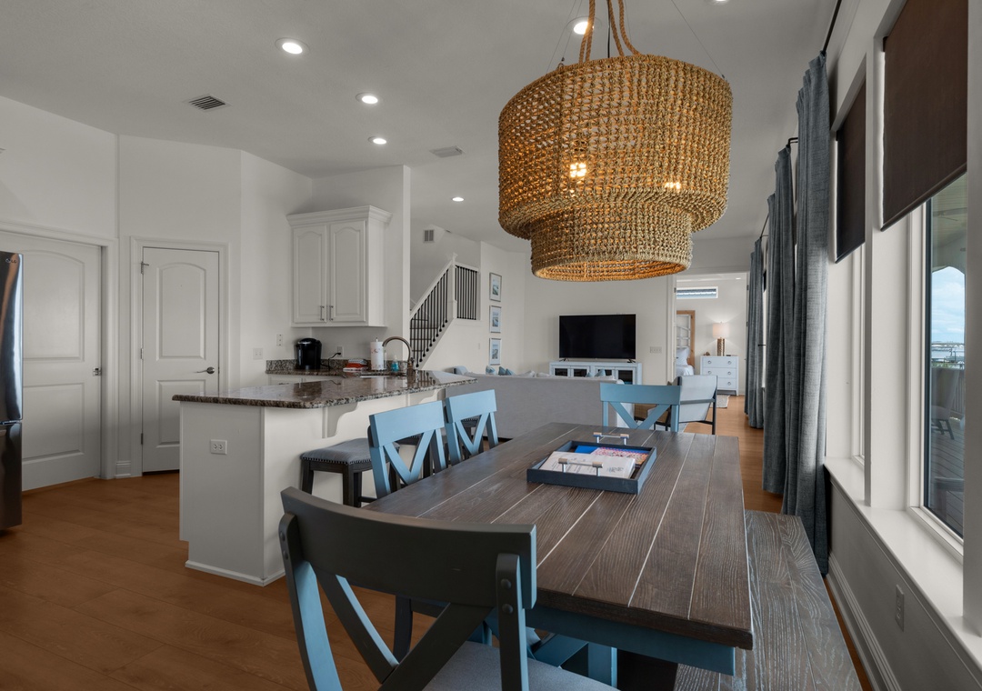 Step inside and find a light-filled, open-concept layout with soaring windows, coastal chic decor, and thoughtful features for group gatherings. The chef’s kitchen includes double refrigerators, ample prep space, and panoramic water views from the dining area. An elevator connects both levels, and the shaded deck and oversized dock invite you to lounge, launch kayaks, or drop a fishing line. With Gulf access nearby, top-notch amenities, and proximity to restaurants, shops, and playgrounds, Let’s Do Sunset is built for beach memories that last a lifetime.