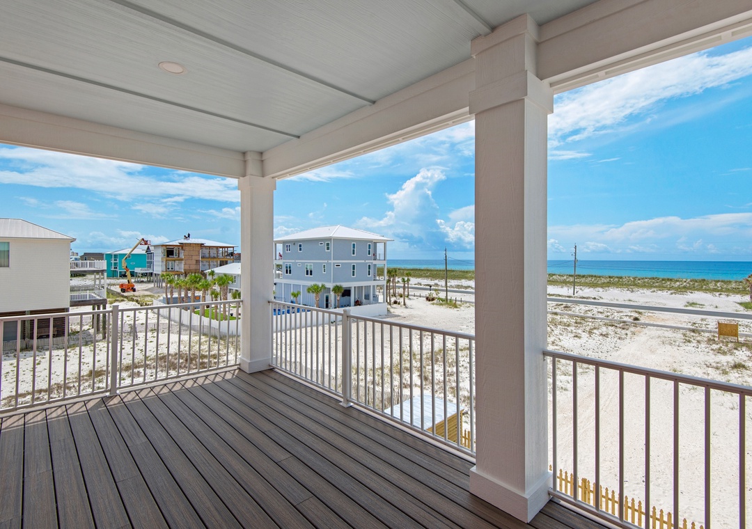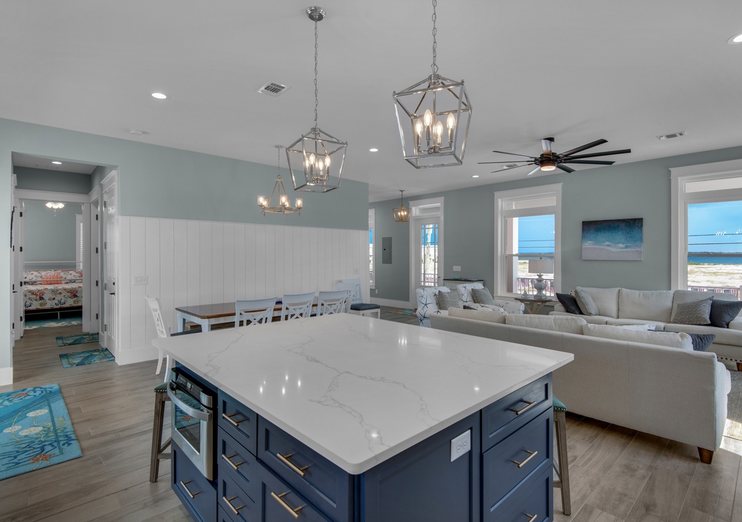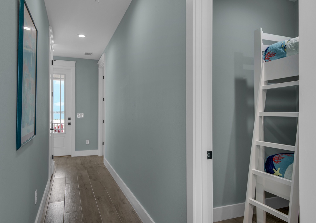 The first living level includes a master bedroom with Gulf views and a king bed, plus a bunk bedroom with built-in queen bunks and a full trundle—perfect for kids or extra guests. Upstairs, the expansive master suite includes a king bed, twin sleeper sofa, luxurious ensuite bath, and private balcony with sound views. Two additional king bedrooms (one Gulf-facing, one Sound-facing) each offer ensuite bathrooms, and a separate bunk room with extended-length twin bunks ensures a fun and comfortable space for children.
