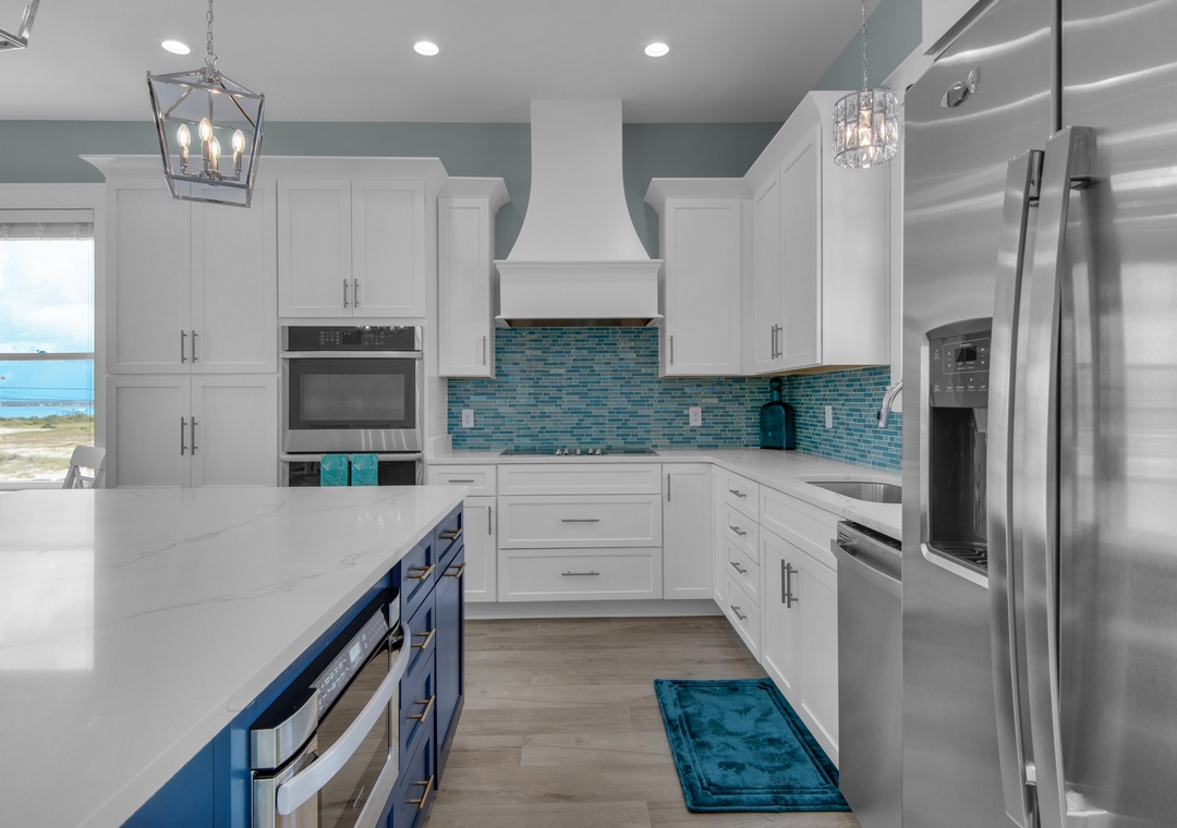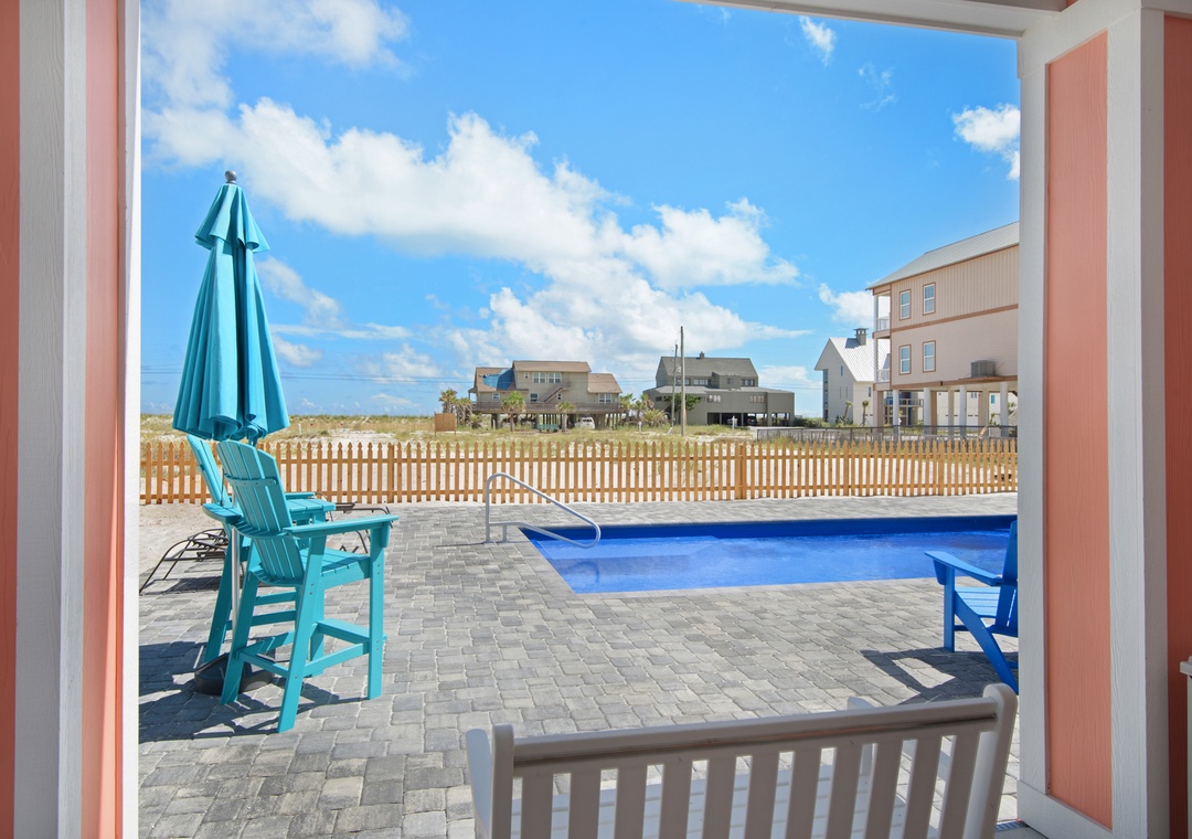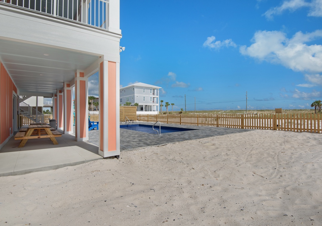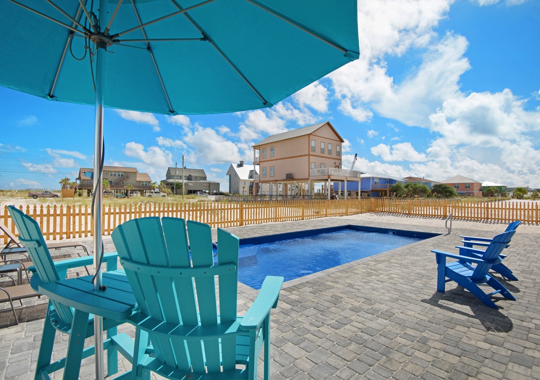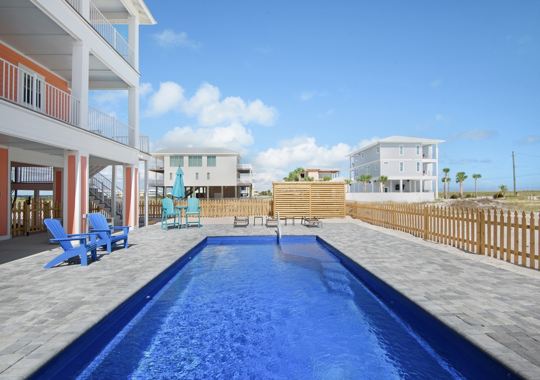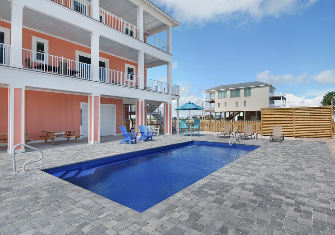 Step into your private oasis with a brick-paver patio, propane grill, and plenty of seating to relax around the sparkling pool. The pool can be heated in cooler months for year-round enjoyment. The outdoor shower, picnic tables, and included beach gear make transitions from pool to beach seamless. A second fridge in the garage makes it easy to stock cold drinks and beach snacks.