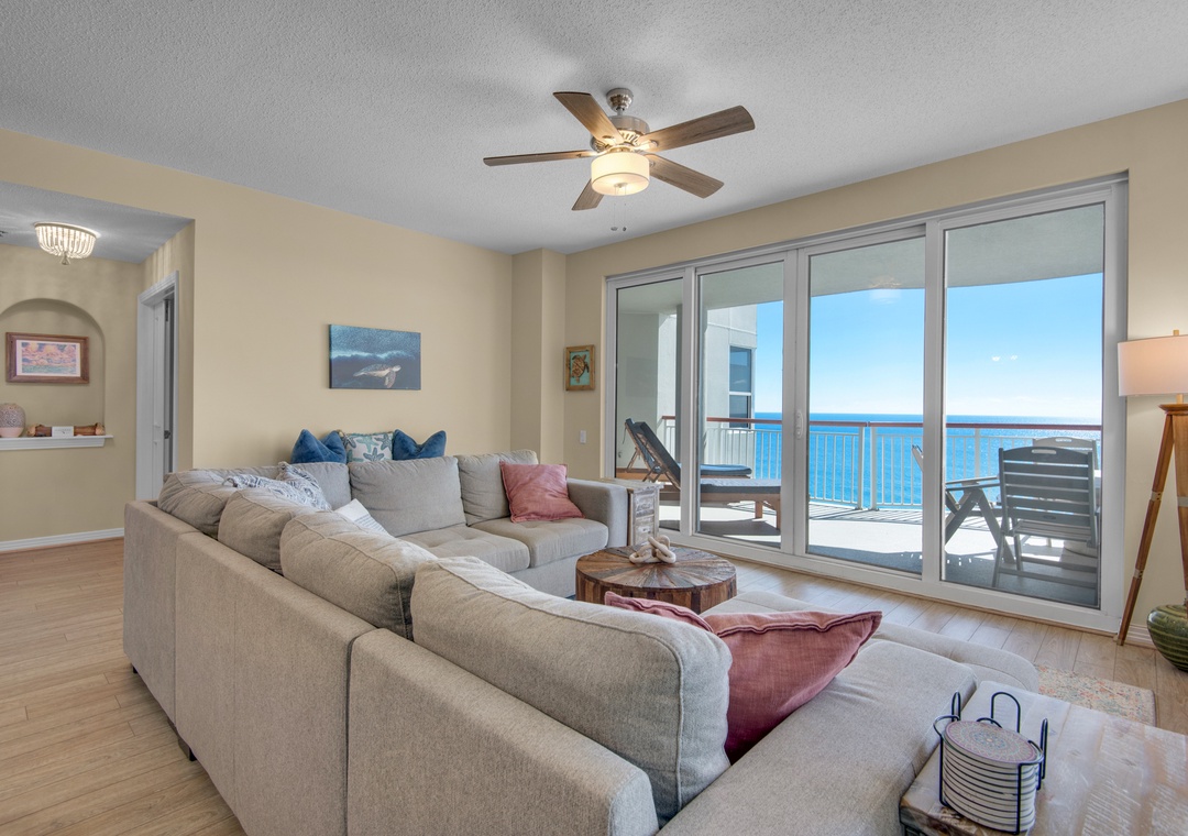 Welcome to Sea Turtle Escape, a stunning 3-bedroom, 3-bath condo located on the 13th floor of Beach Colony East. Recently renovated with brand-new flooring, updated décor, and a modern kitchen, this beautifully designed unit offers a bright, open layout and expansive Gulf views from the moment you walk in. The sectional sofa in the living area includes a queen sleeper, providing flexible sleeping arrangements.