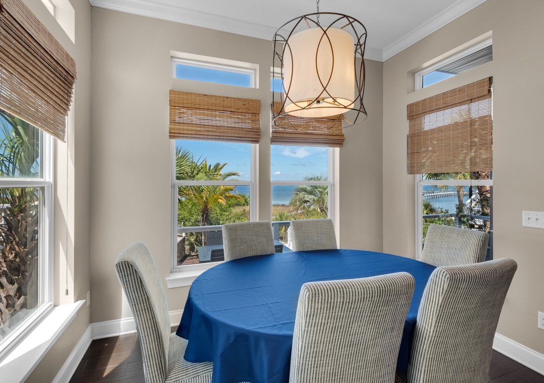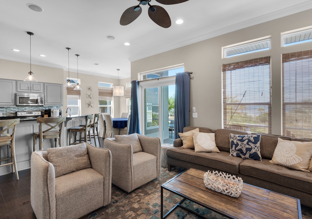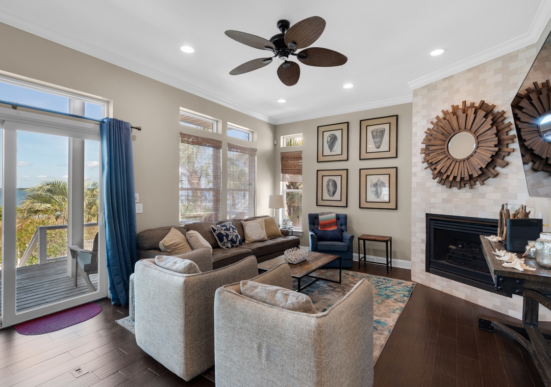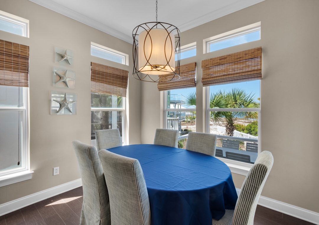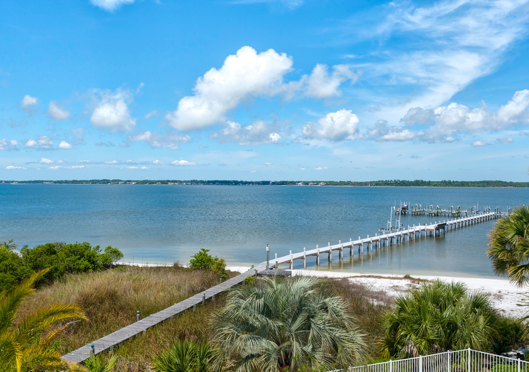 Located along the calm waters of the Santa Rosa Sound, Sun Dancer offers tranquil views, lush landscaping, and access to a sandy beachfront and pier—perfect for swimming, paddleboarding, and fishing. Nestled in a quiet Navarre neighborhood, this spacious three-story home is designed for families and friends to relax and reconnect.