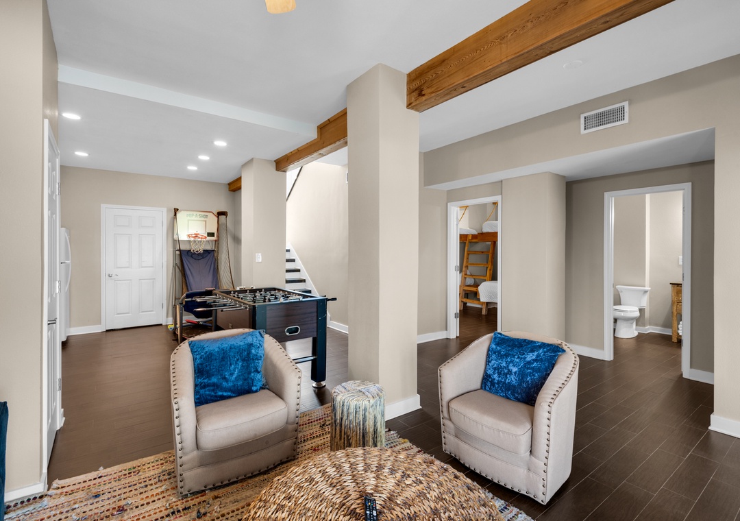 The upper level features the luxurious master suite with a king bed, a spa-like ensuite bathroom, and a private balcony overlooking the Sound. Two additional bedrooms—one king and one queen—are also located on this level, each equipped with flat-screen TVs and access to another full bathroom. The ground level includes a private den, kitchenette, sleeper sofa, and a showstopping bunk room with four queen bunks—perfect for kids—along with a full bathroom and walk-in shower.