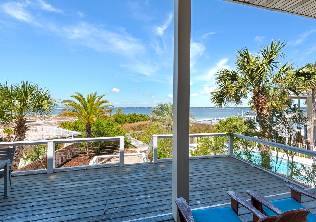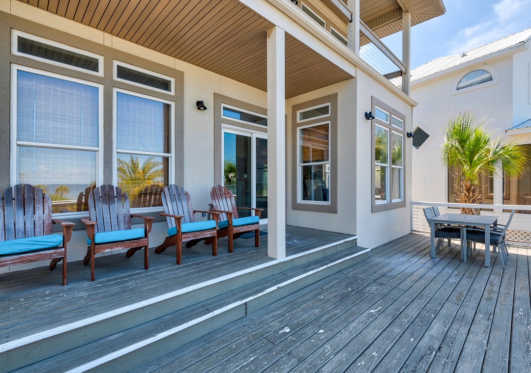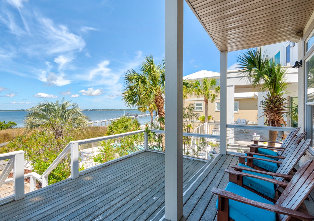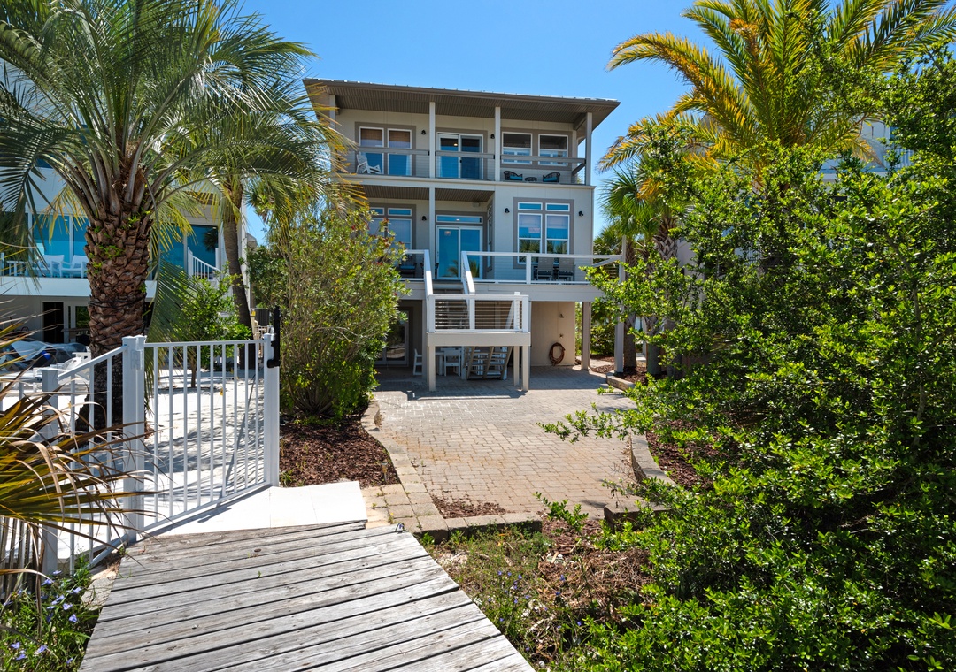 We just returned from a week here. We had 2 families (5 adults, 4 kids). The house is on the sound side with a dock leading to the beach. It was beautiful, private, calm. We never even went over to the Gulf side, no need to! Holly/Greg were great to work with, answered questions quickly and even had a new grill delivered when we inquired. We'd definitely stay here again! We've done this type of trip for 7 years and this is the best experience we've had so far (with home and management). Thanks for a memorable trip!- Reviewed On: 4/18/2014