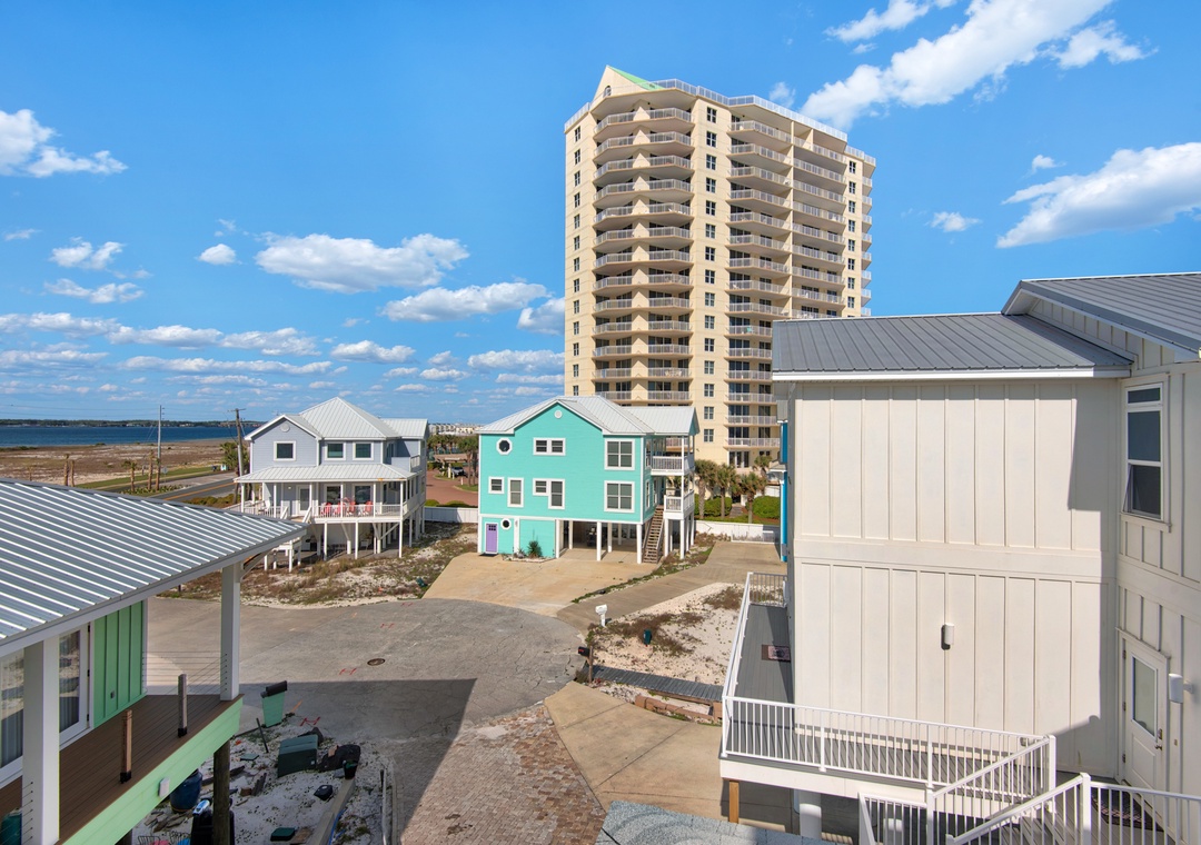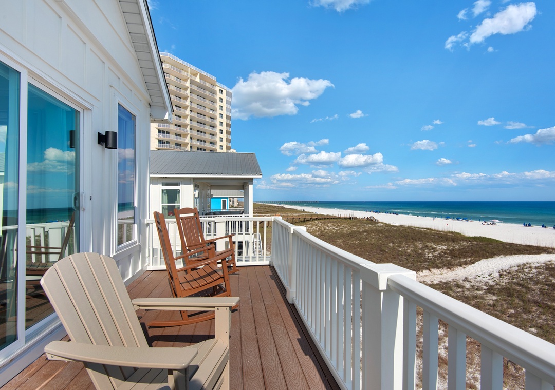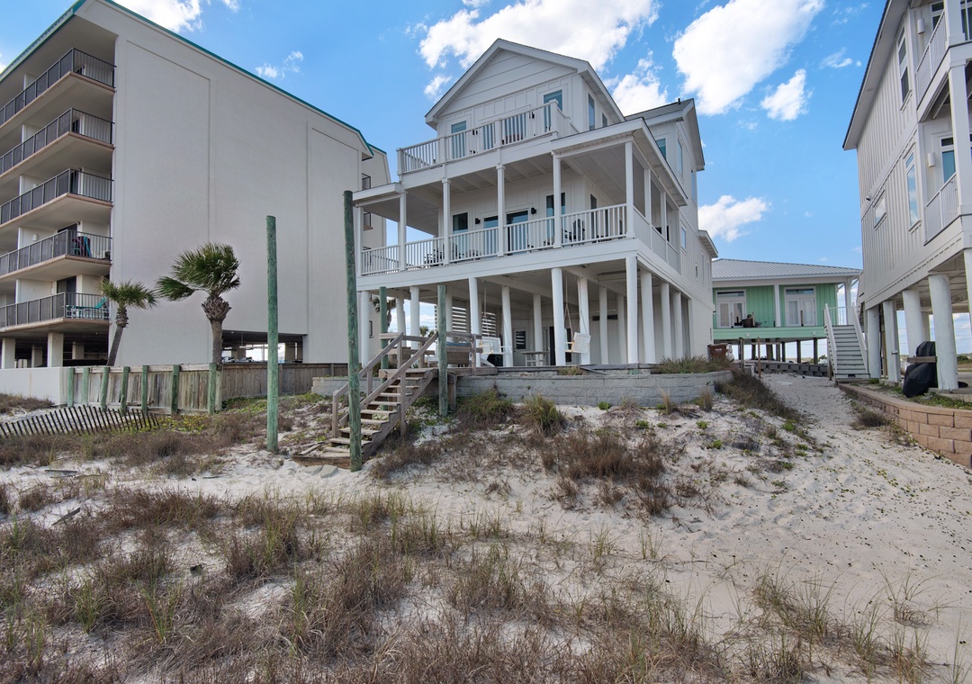 The open-concept main floor features a full kitchen with modern essentials, a dining space, and a comfortable living area with a sleeper sofa. Step outside to the wraparound deck to grill or catch sunset views over the Gulf. Upstairs, the master suite includes a king bed, spa-style bath, and a private balcony with panoramic beach views. A second upstairs bedroom also offers private balcony access, while the bonus bunk room downstairs features two sets of custom-built bunks to sleep six. A second den with a bar and TV downstairs makes the perfect hangout zone for teens or multi-family stays. The ground-level deck is ideal for hosting events, wedding receptions, or large family meals under the stars.