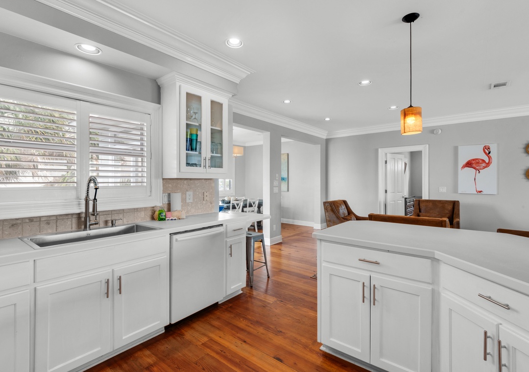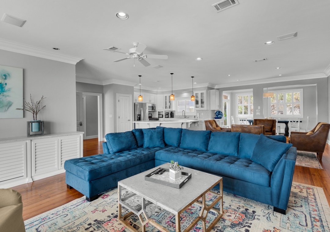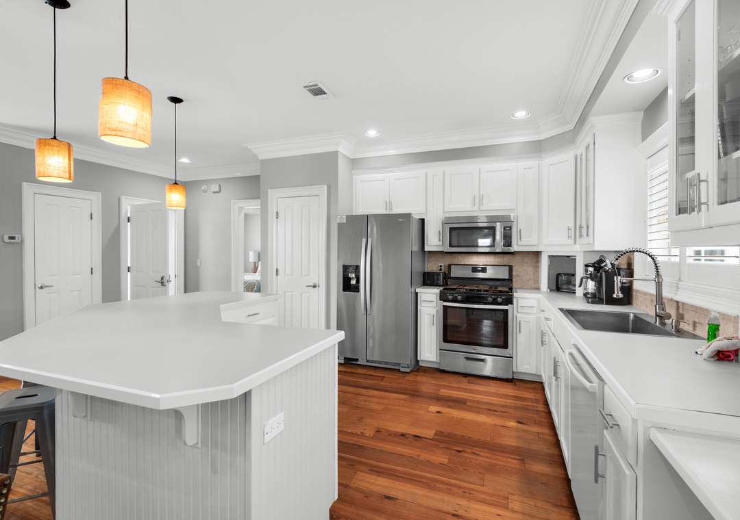 Inside, the home is divided into three sleeping zones for comfort and flexibility. Zone 1 features a king master suite and a second bedroom with two queen beds. Zone 2 includes three bedrooms, two with a queen bed and twin bunk beds, and one with a queen bed. Zone 3, located downstairs, includes a king bedroom and a custom-built bunk room with two sets of queen-over-queen bunks (sleeps 8!), plus a shared bath. In total, The Sunshine Gulfside sleeps up to 22 guests with plush pillow-top mattresses in every room.