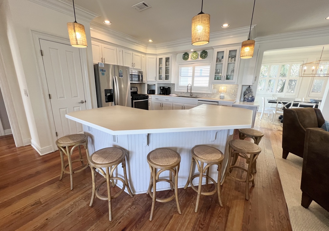 My extended family enjoyed a fantastic long weekend at this home. We had 5 families with 17 people total. The common area (living/kitchen/dining) was perfect for all of us with plenty of seating. Access to the beach is very close, and there is ample outdoor space around and under the home for kids to hang out. There is a second refrigerator downstairs which was very helpful to us. One clarification on the bathrooms--with the exception of the Master bath, all are hallway access, not Jack/Jill style shared between bedrooms. In all, the home was perfect for us, and we would definitely come back to stay.- Reviewed On: 1/23/2019